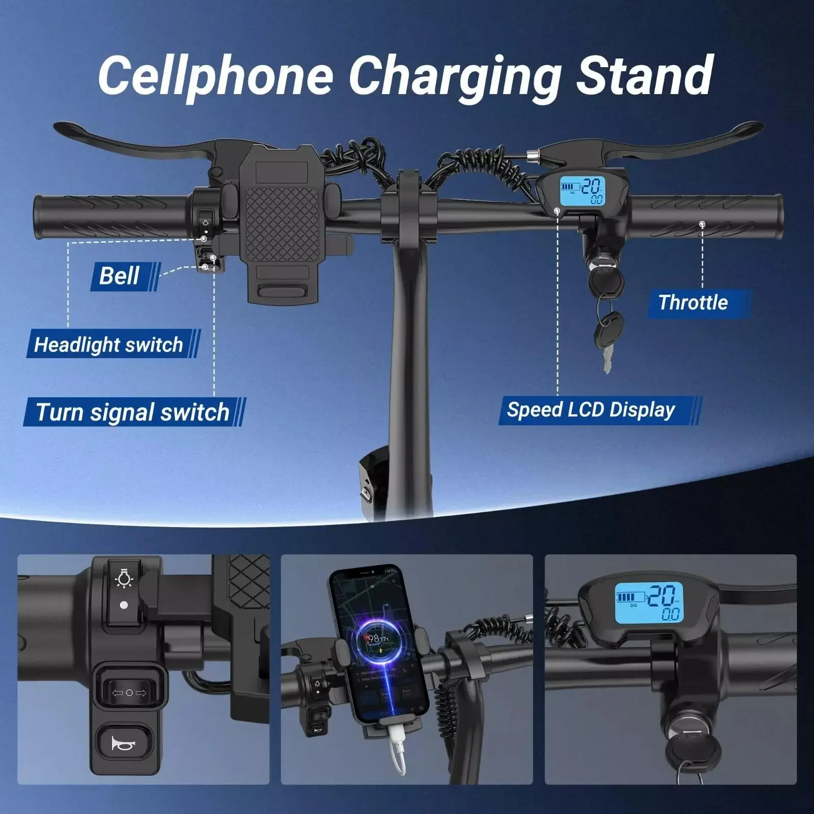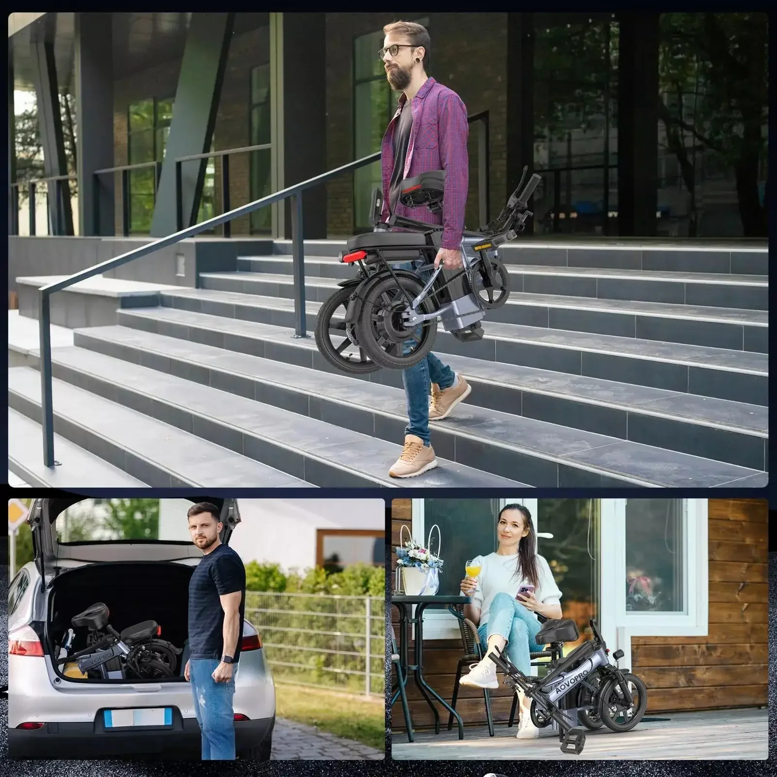 Folding and Portable: AOVOPRO EB60 electric bicycle has a foldable body, with a folding size of only 27.6 * 27.6 * 23.3 inches and a weight of only 50 pounds.You can easily lift it up or put it in the car to travel with you.In addition, we have added a phone holder for you to use navigation at any time.What's even more surprising is the USB charging port, which allows you to charge your phone at any time, bringing you a full sense of security for your cycling.In addition, I also gave you a password lock as a gift to protect your scooter from theft