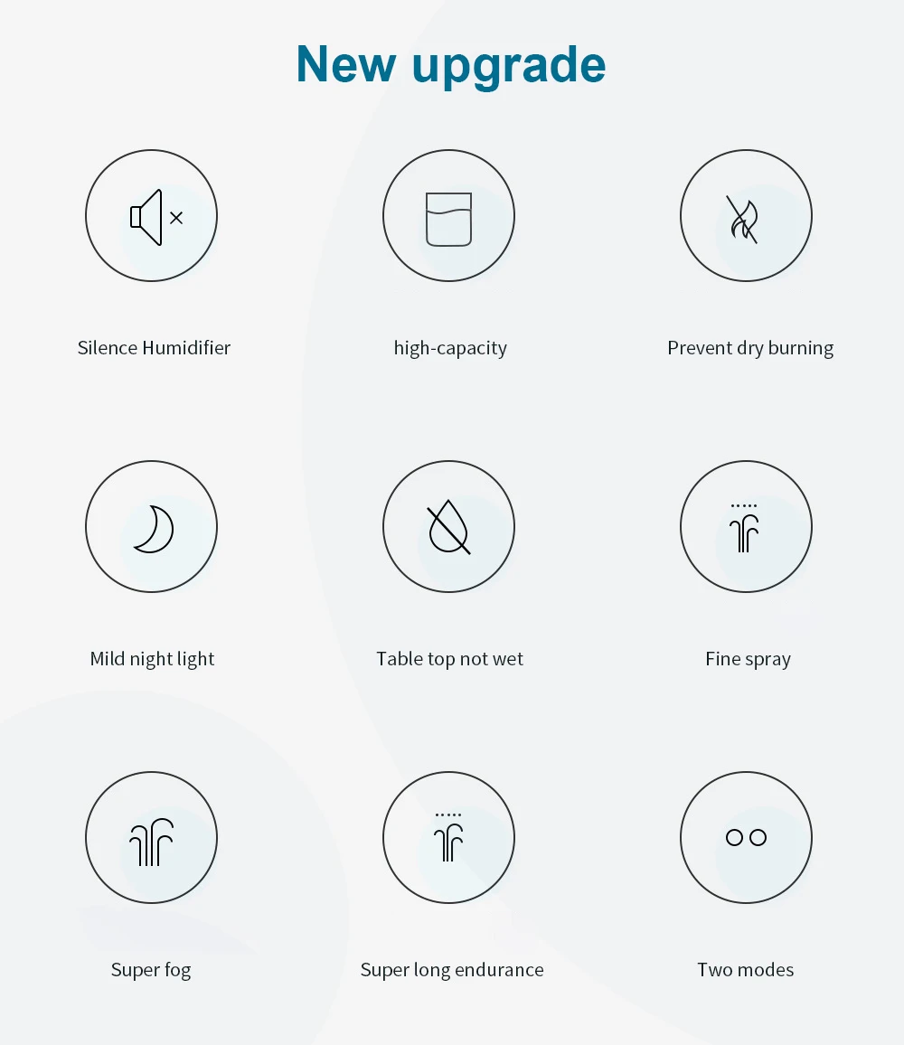 【TWO SPRAY MODES & AUTO SHUT-OFF】This humidifier has two mist modes: Continuous and intermittent mode. On continuous mode, it will automatically shut-off after 4 hours. On intermittent mode, it will automatically shut-off after 4 hours. It shut-off when the water level is low. Thus, you don't have to worry about the humidifier being damaged in the absence of water. You can use it at night without worrying about safety.