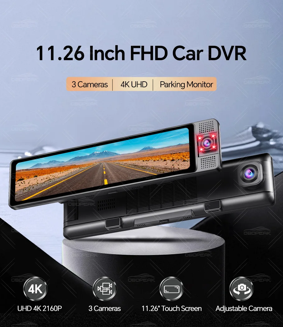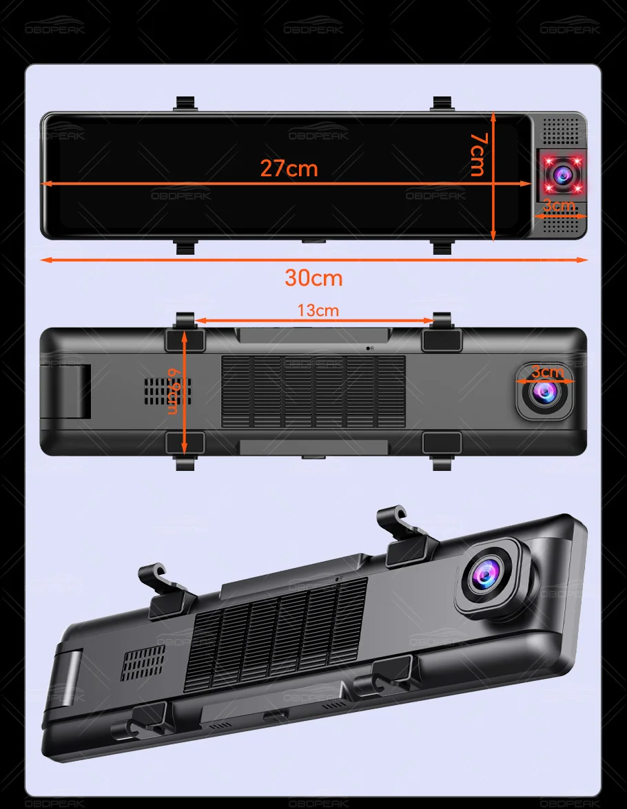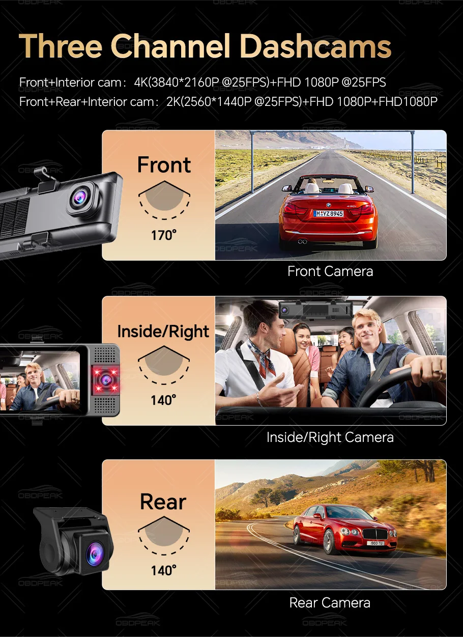 The OBDPEAK H330 can switch screen display modes, with full screen display at will. It can display front+interior/front+rear on 2 screens, and front+interior+rear on 3 screens