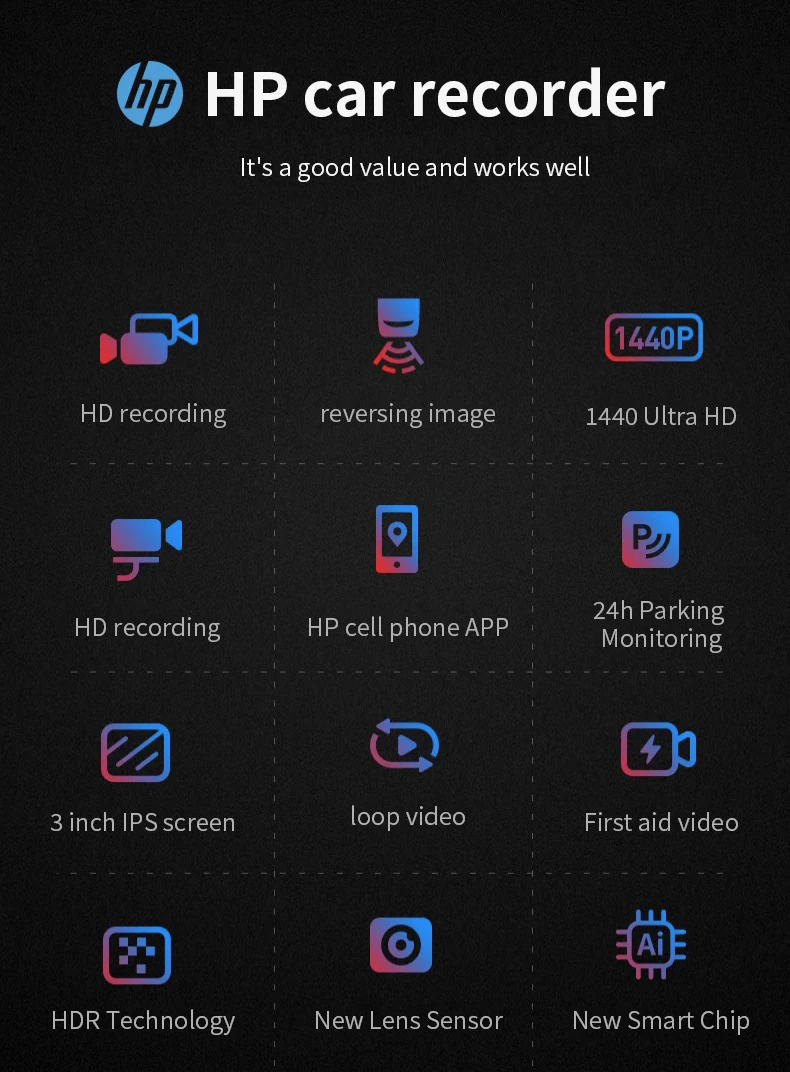 This HP F969 Car Recorder has many other features, such as loop recording, G-Sensor, and more. Please make sure the headphone jack for the rear camera is firmly inserted to prevent undetected rear camera.