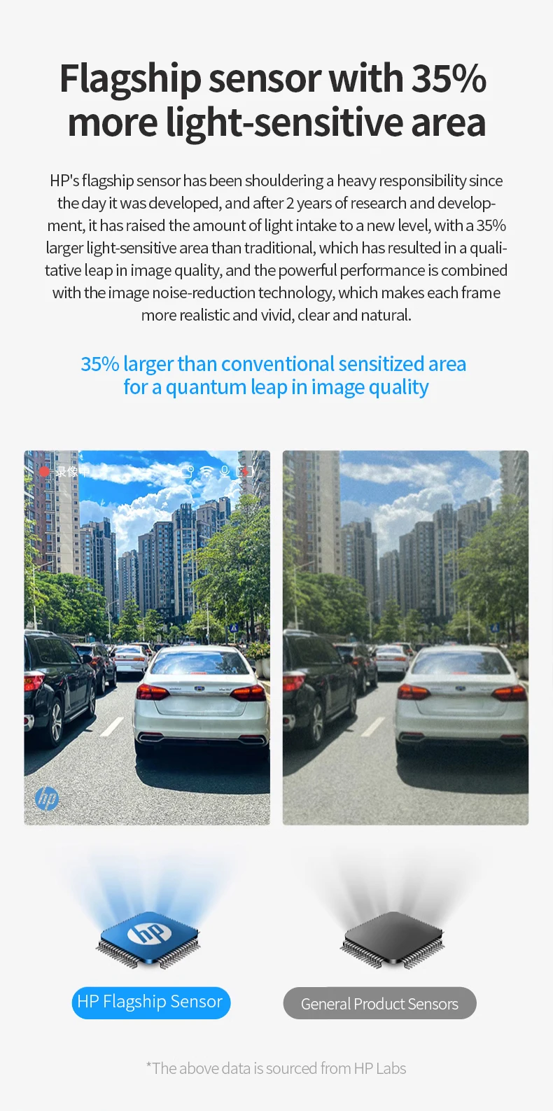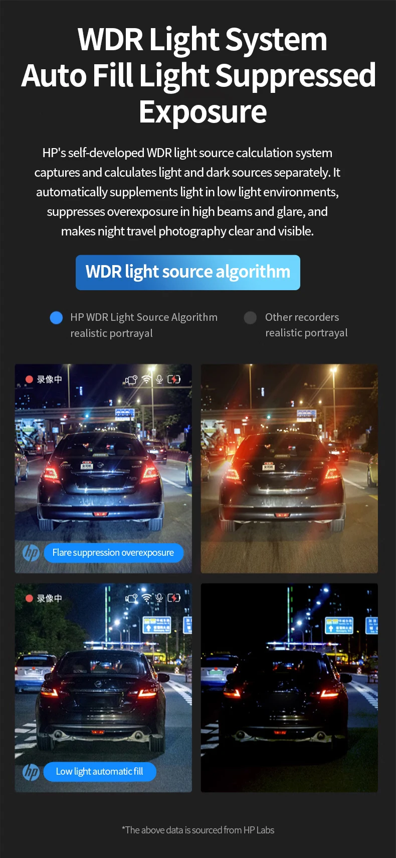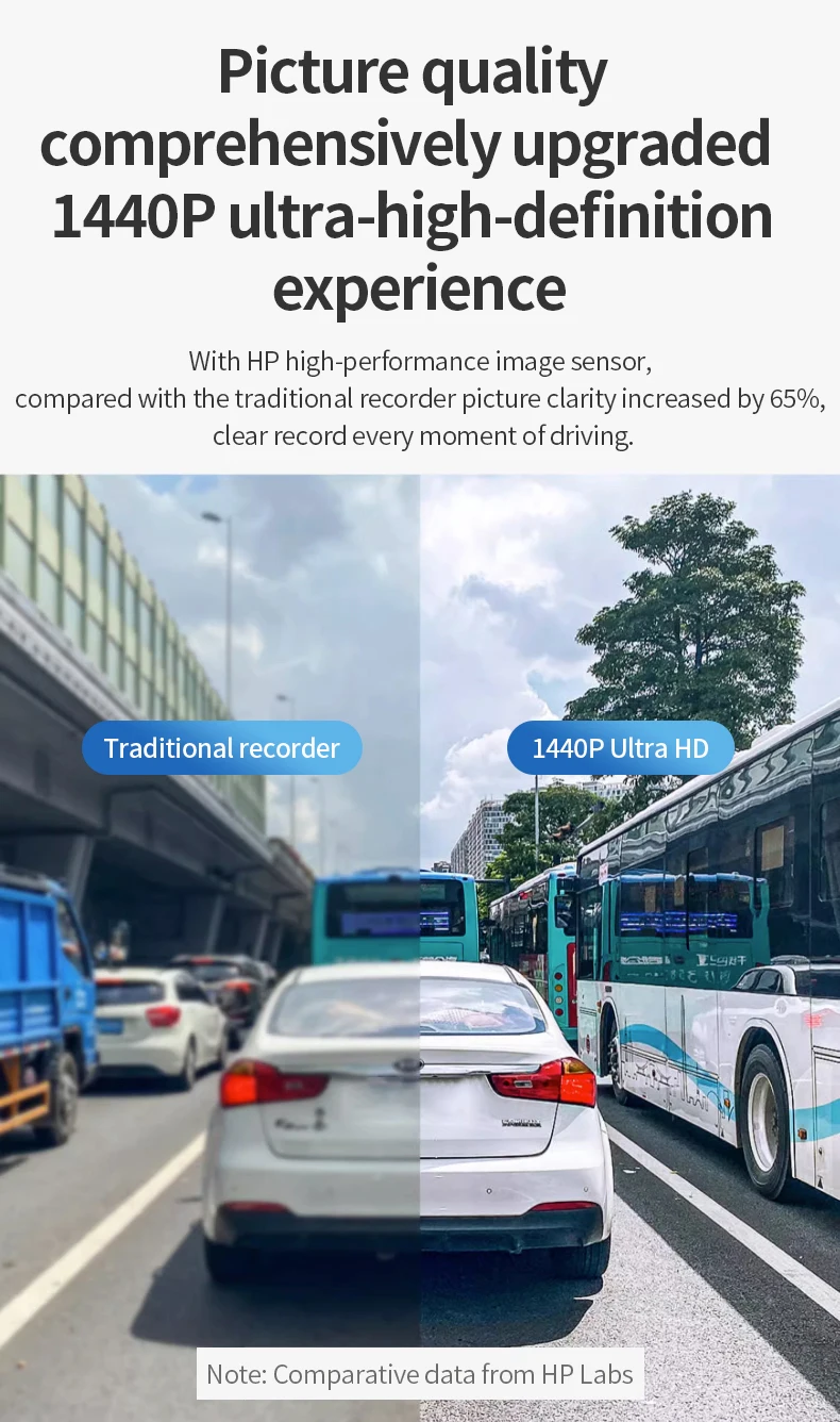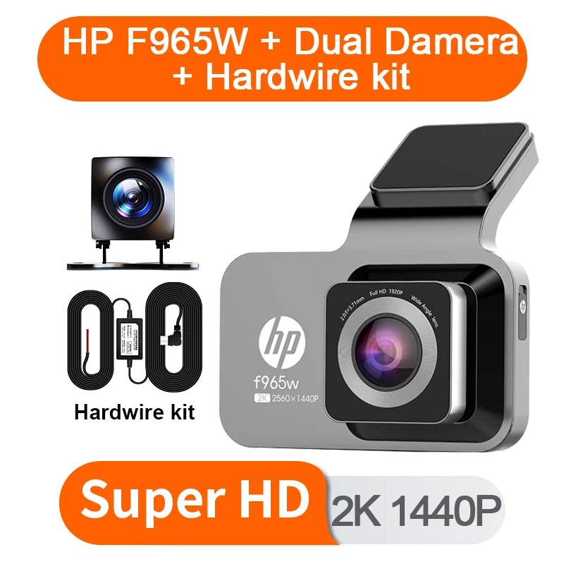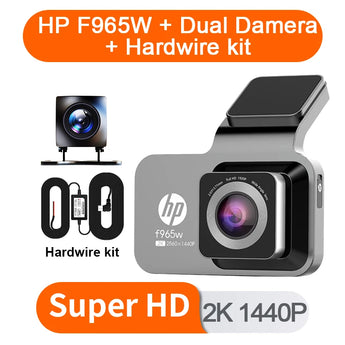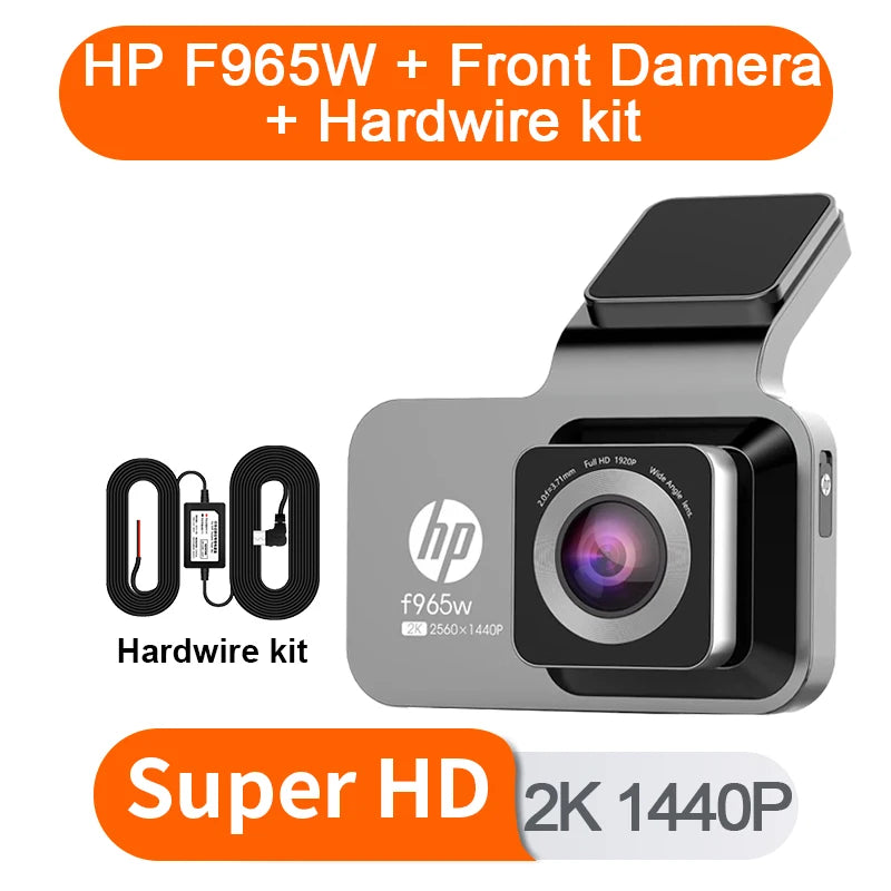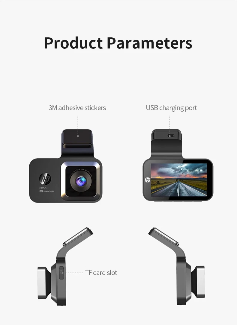 This HP F965 Car Driving Recorder is equipped with 140° ultra wide angle camera to provide a full view of your car.2K + 1080P Ultra HD quality records every detail of your driving process, providing you with reliable evidence of accident disputes.2K + 1080P Ultra HD quality records every detail of your driving process, providing you with reliable evidence of accident disputes.2K + 1080P Ultra HD quality records every detail of your driving process, providing you with reliable evidence of accident disputes. Main Lens: 6-group full HD glass lens, 140º diagonal, aperture F1.5
