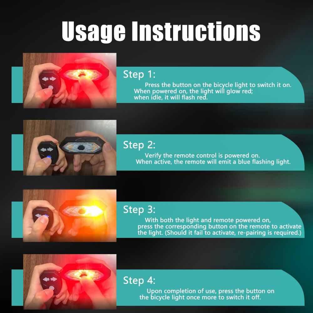 • Remote Controlled Turn Signal :Experience the convenience of remote-controlled turn signals on your bicycle, enhancing your night riding safety with this waterproof and rechargeable tail light.