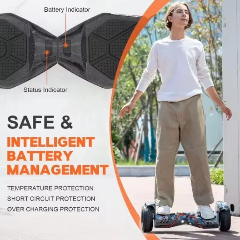 | Tire Type | Non-Pneumatic Solid Tires | Max Speed | Up to 12 km/h (7.45 mph)(For safety, the hoverboard will alarm if thespeed exceeds 12 KM/H) |