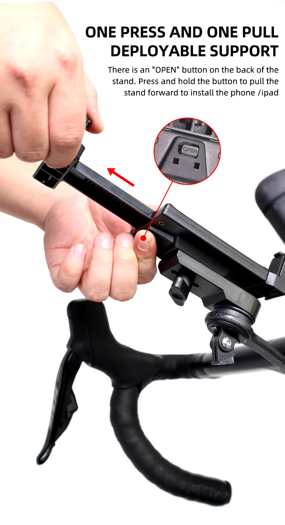 There is an "OPEN" button on the back of the stand. Press and hold the button to pull the stand forward to install the phone /ipad