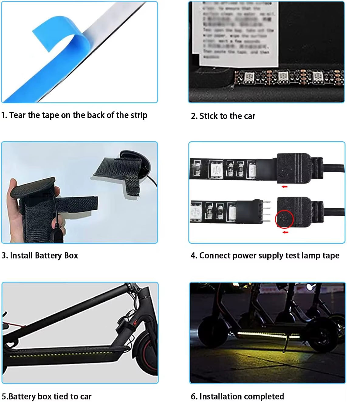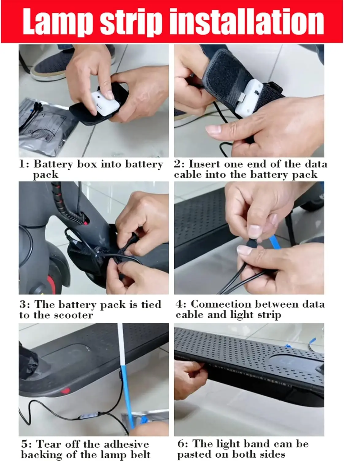 【EASY INSTALLATION】Scooter accessories glue on the back of the lamp belt. Apply the adhesive to the lamp band for 1-2 minutes, then glue the lamp band. Install the battery box and connect the test lamp ribbon of the power supply. Battery box was attached to the car and installation completed.