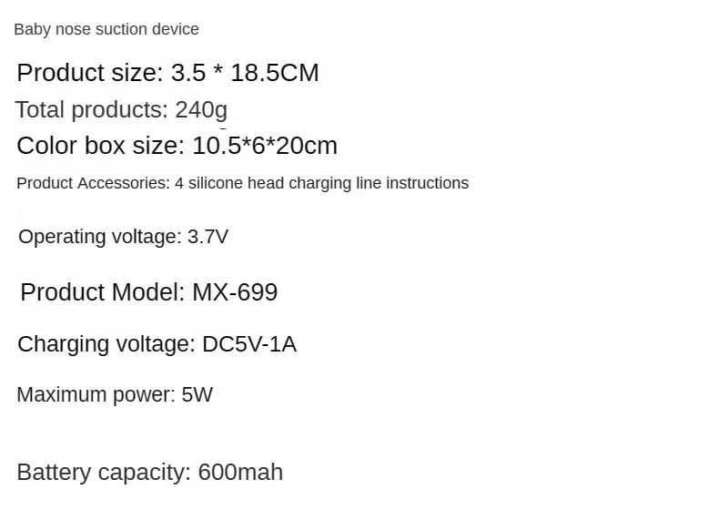 The maximum suction power is 65KPA, which is enough to provide a good nasal suction experience for children aged 0 to 12 years old.