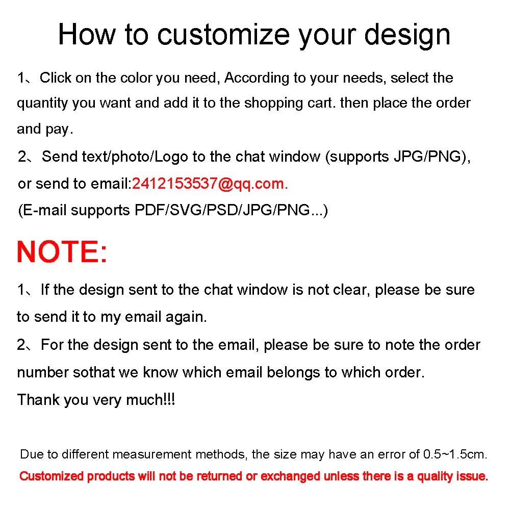 If the design can't be uploaded to the custom template,Send text/photo/Logo to the chat window(supports:JPG/PNG), or send to my email:2412153537@qq.com(supports:PDF/PSD/JPG/PNG/AI...).
