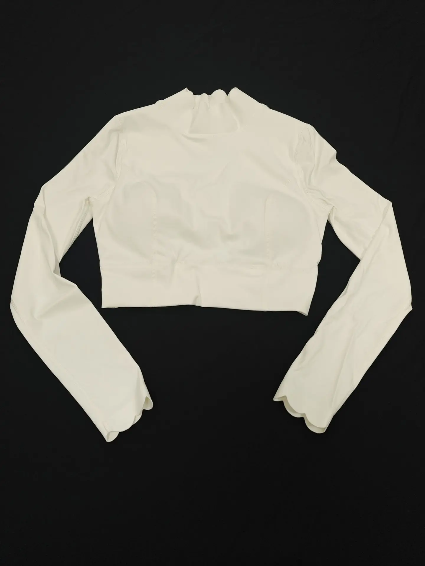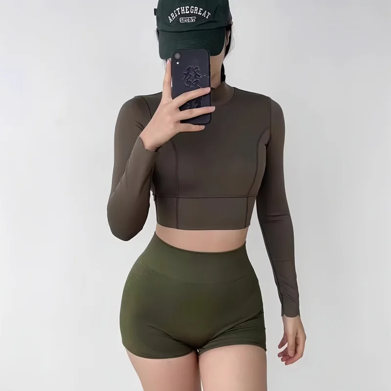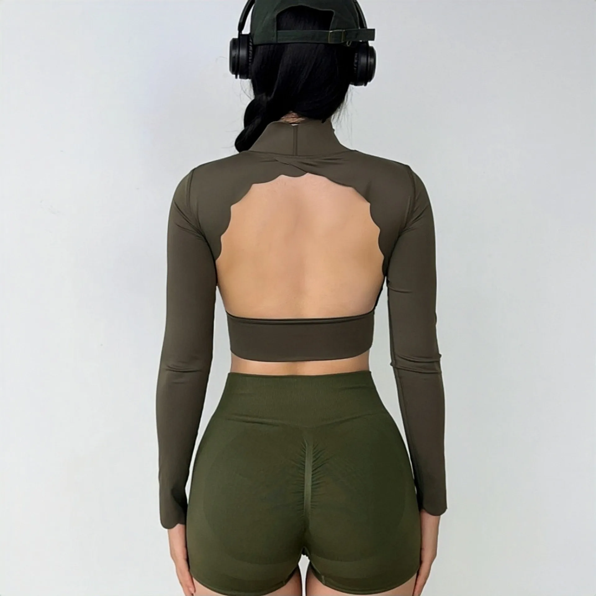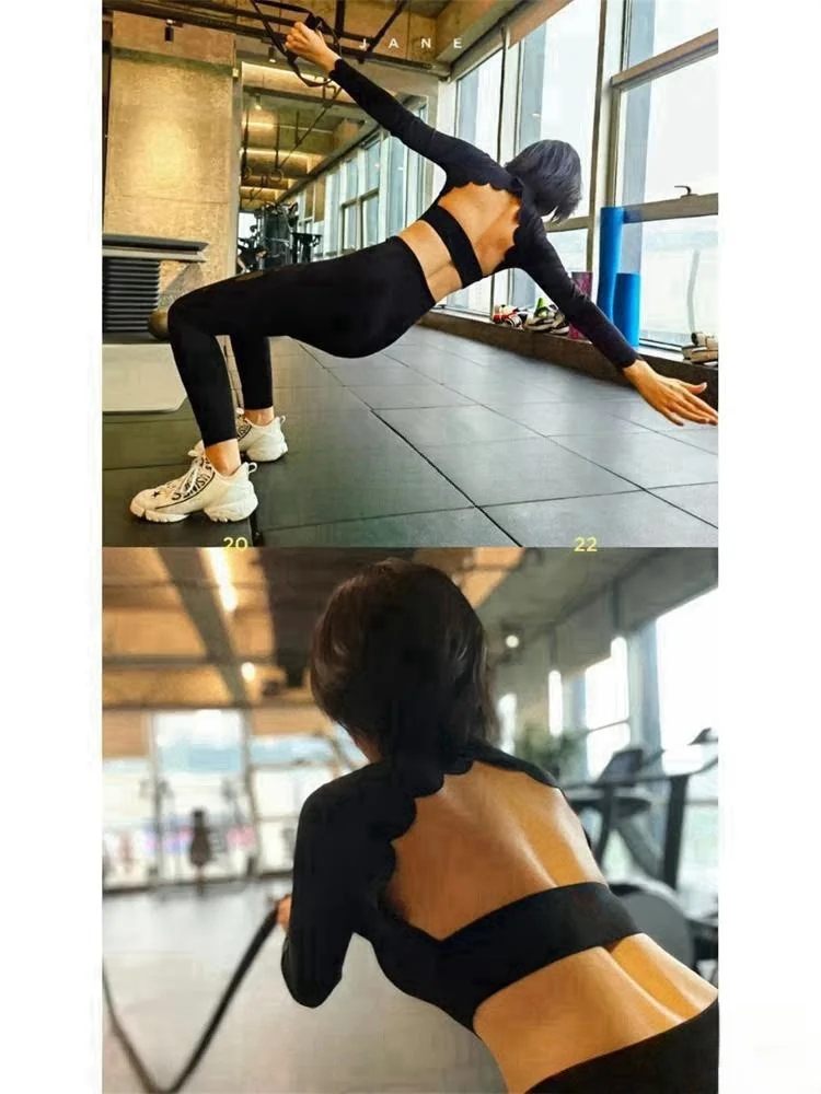 Shell Lace Backless Yoga Clothes Long Sleeve Tight Slimming Sports Running Leggings Workout Training Top with Chest Pad