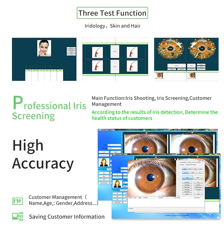 This machine will help the client know his health condition frankly ,including the problem which you have get in the former ,now and future .and the Iridology will be your health counselor, tell you how to keep away from the illness and sub-health.