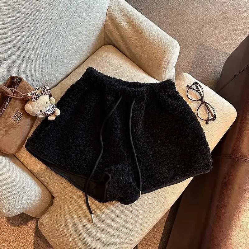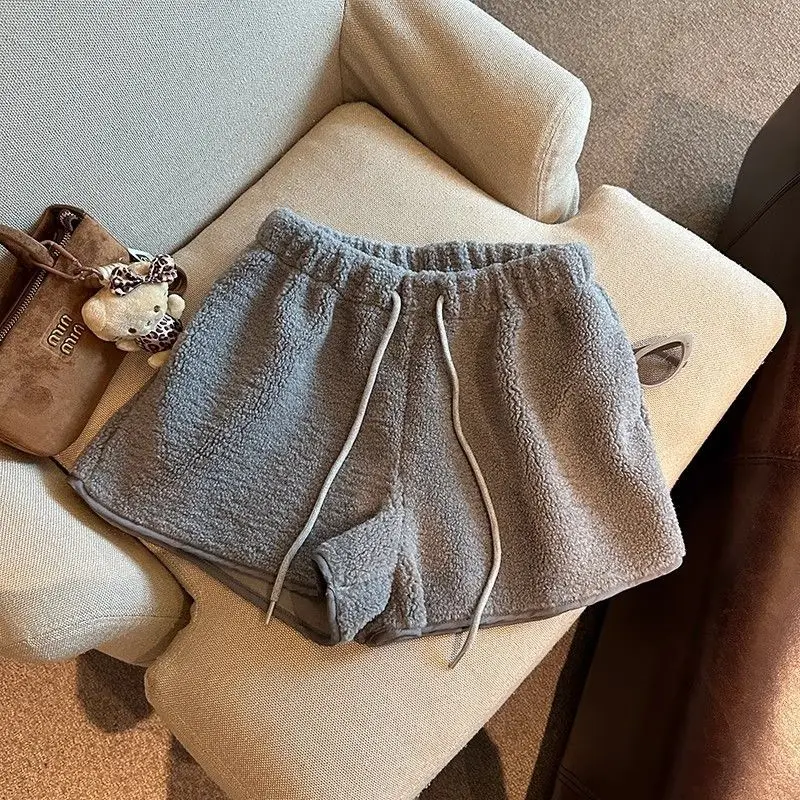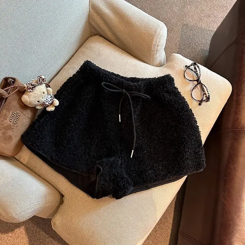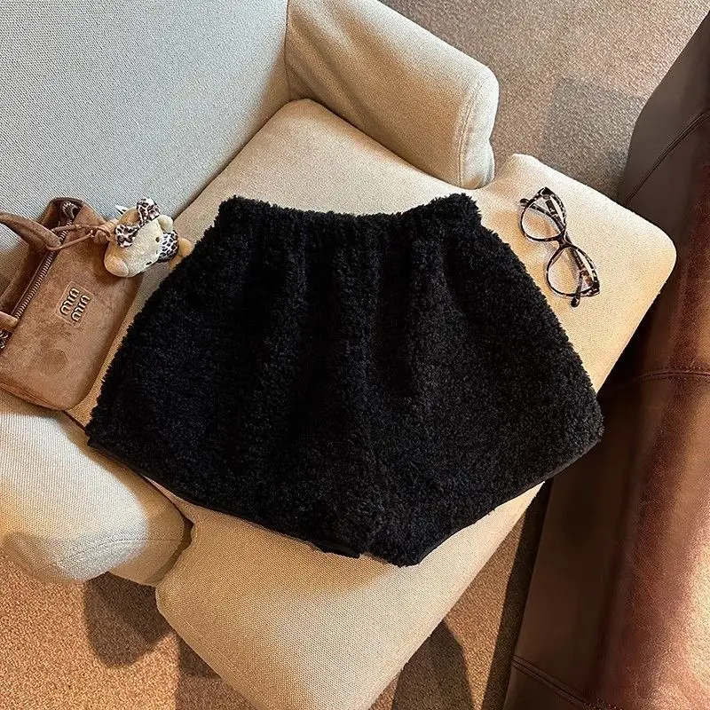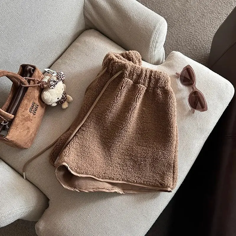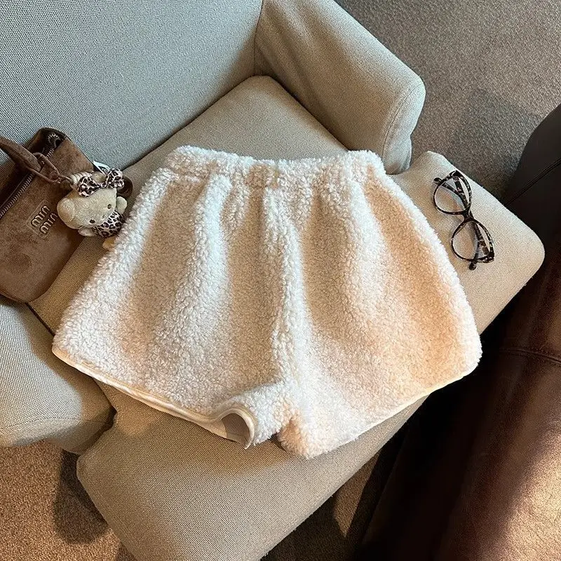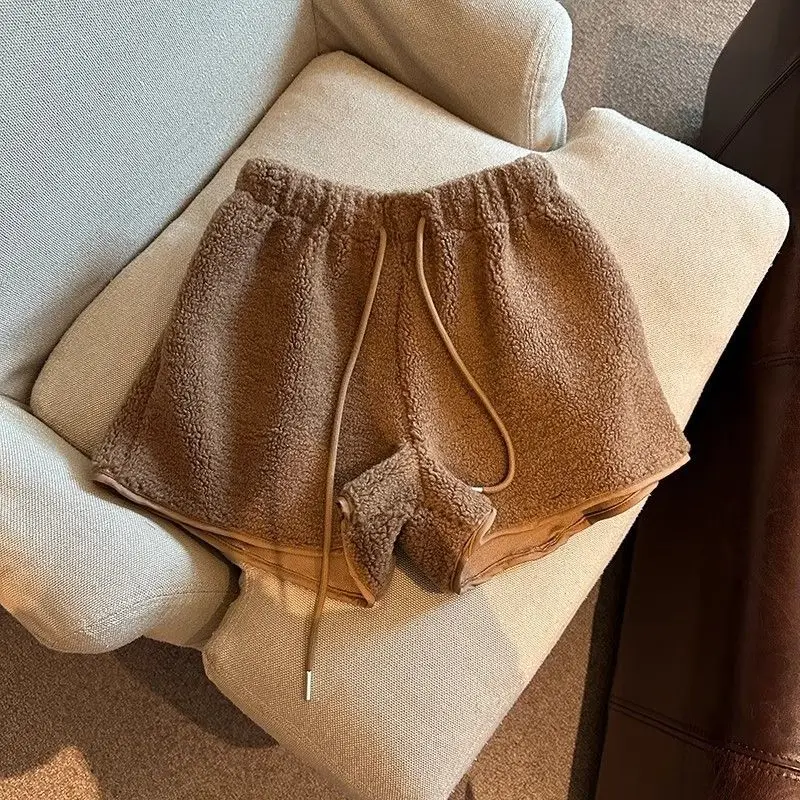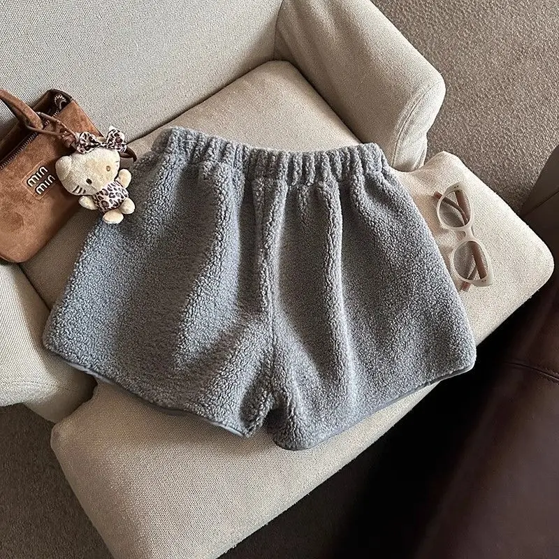 2025 Korean Style High Waist Lamb Velvet Short Pants Women'S Autumn Winter A- Line Slimming Wide Leg Warm Plush Boot Pants