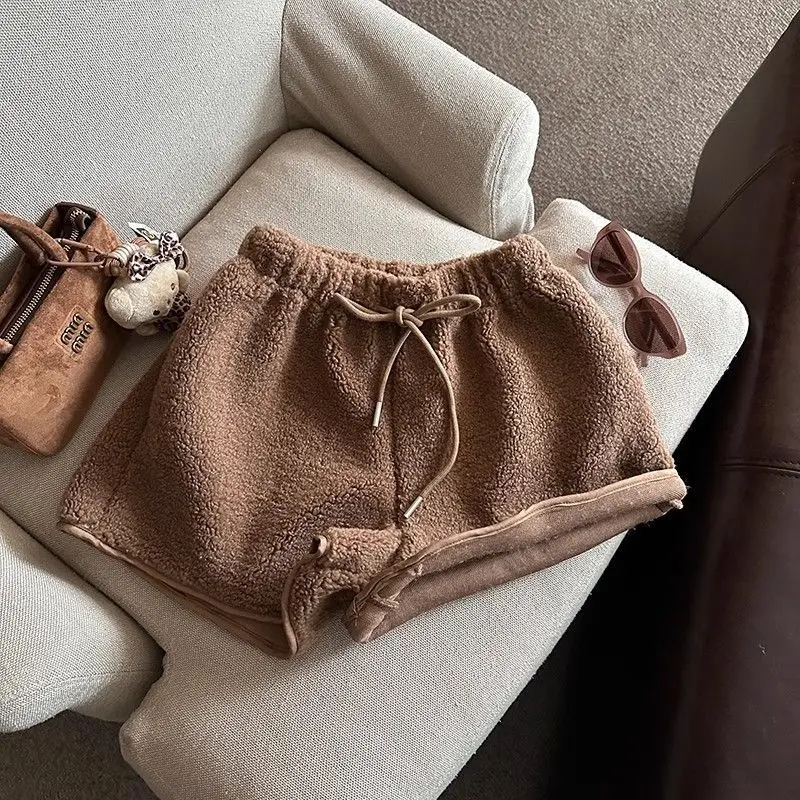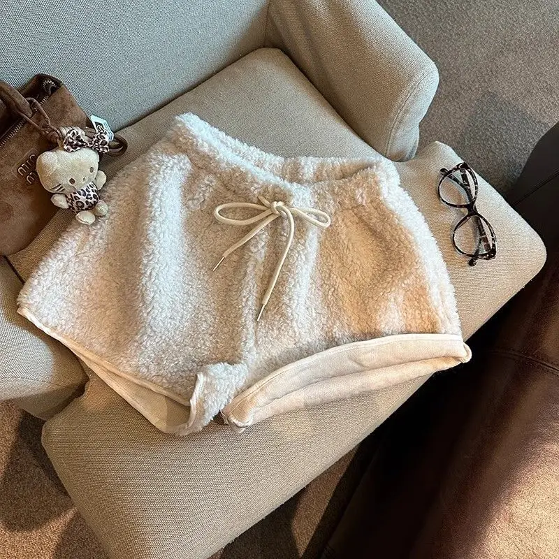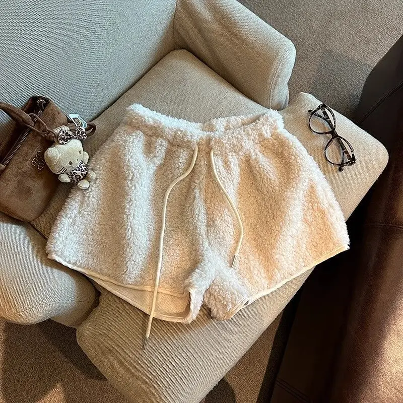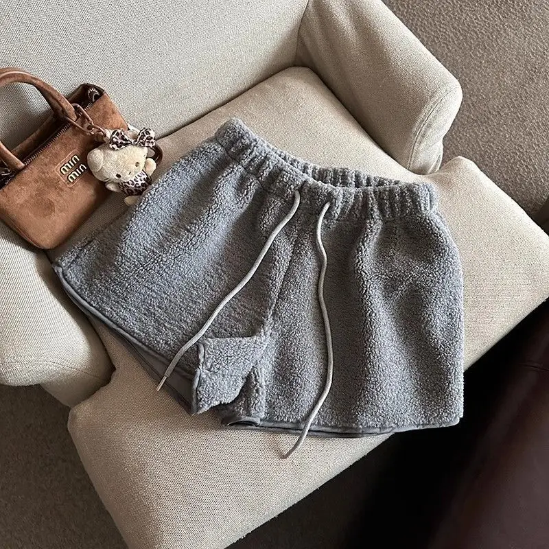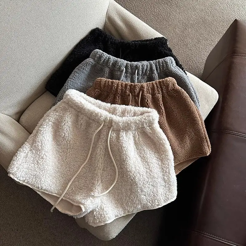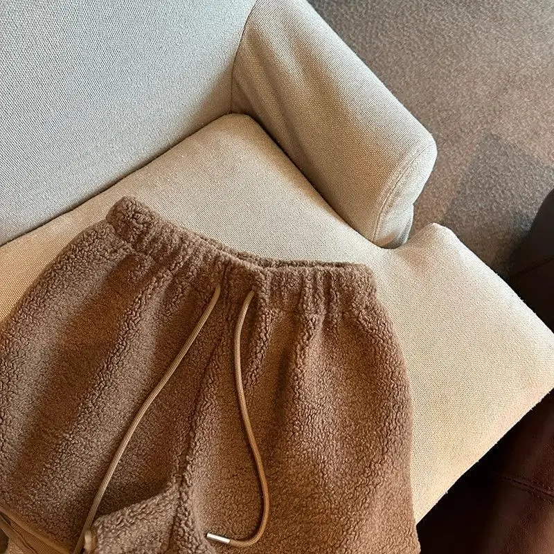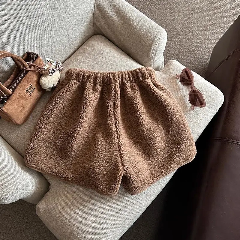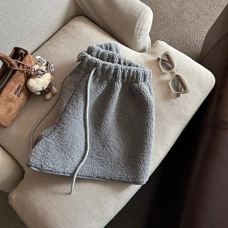 2025 Korean Style High Waist Lamb Velvet Short Pants Women'S Autumn Winter A- Line Slimming Wide Leg Warm Plush Boot Pants