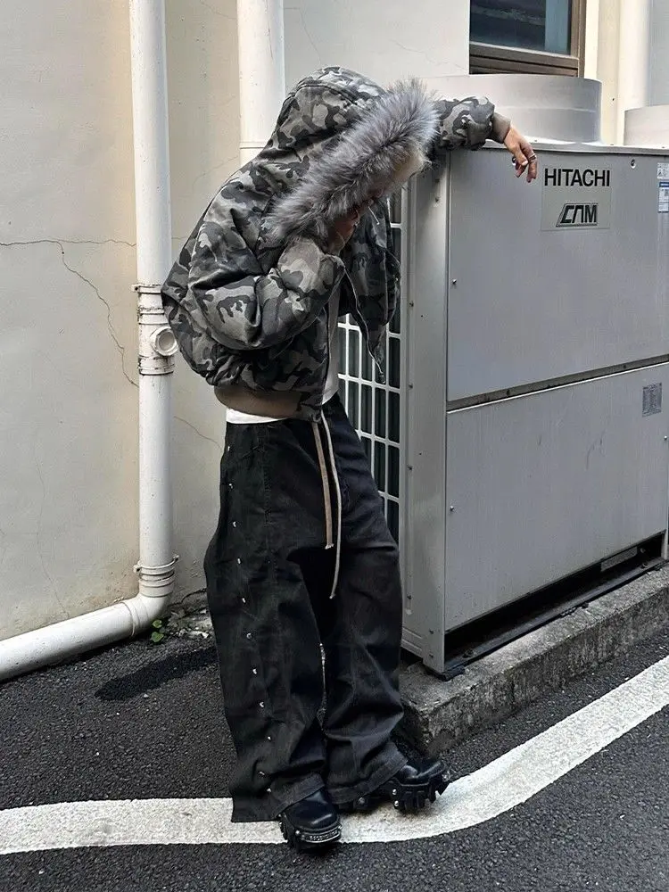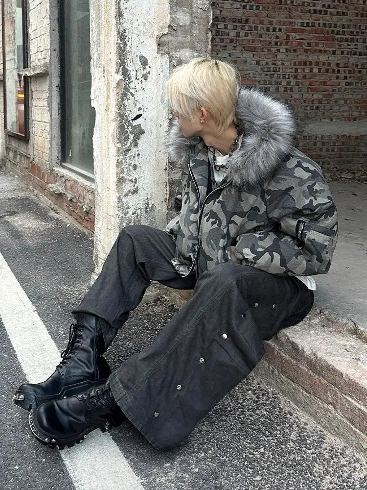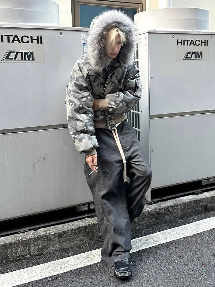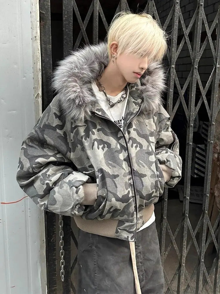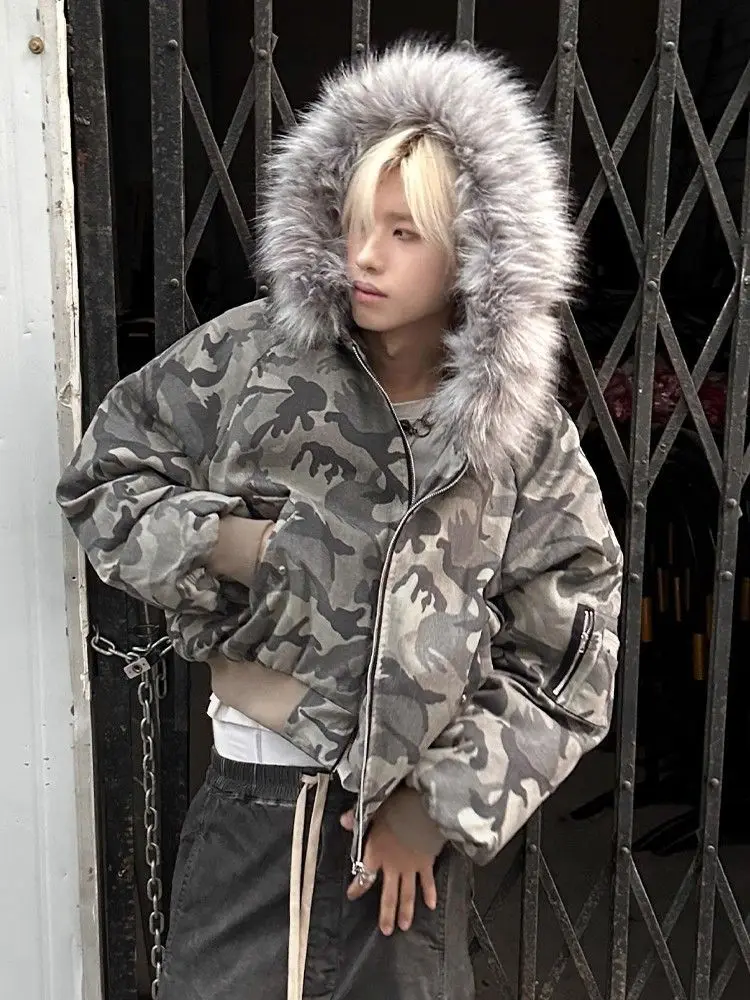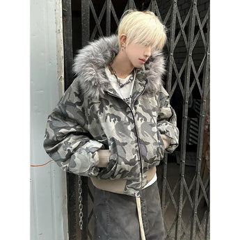 American Winter Camouflage Fur Hooded Jacket Men Outerwear Thick Short Parkas Coat Faux Collar Parkas Casual Aesthetic Retro New