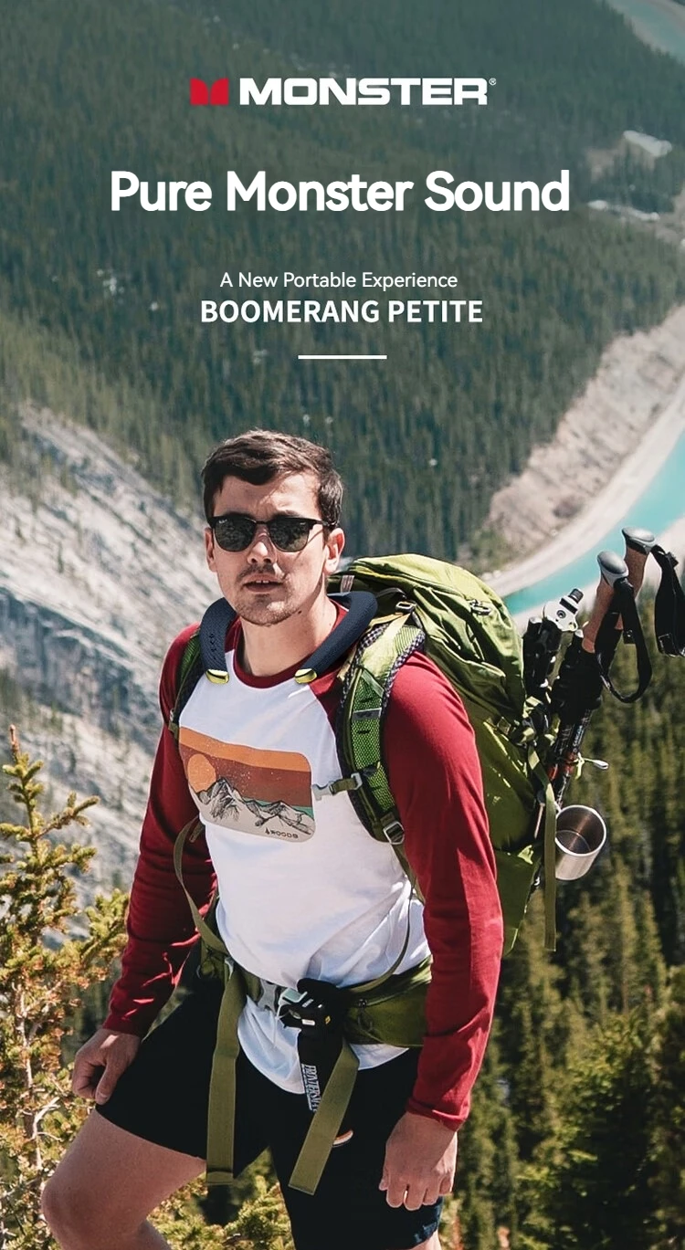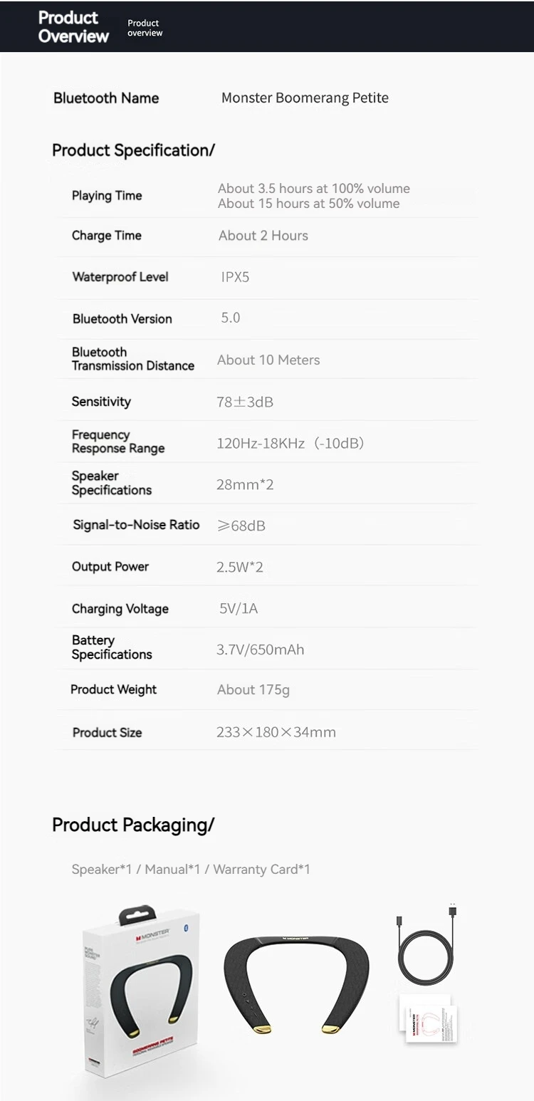 The Monster Boomerang Petite Neckband bluetooth Speaker is based on ergonomic design, once you put this wearable speaker around your neck, you’ll hardly know you’re wearing it, weighing only 0.46 lb (216 g), and you’ll never feel a burden by leaning lightly on the shoulder. Stay comfortable for listening all day.