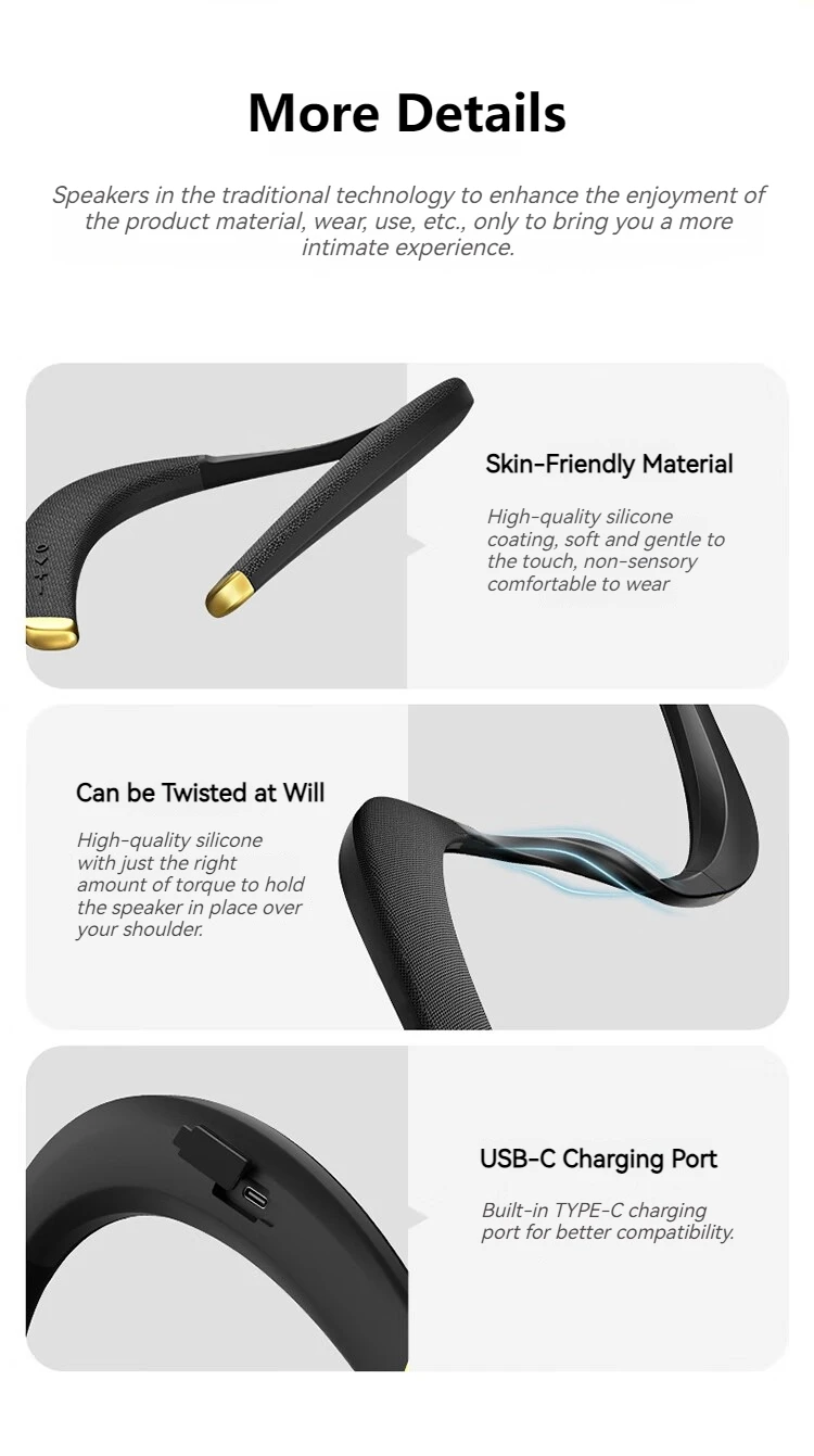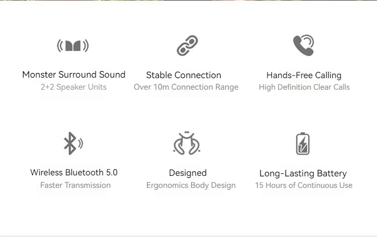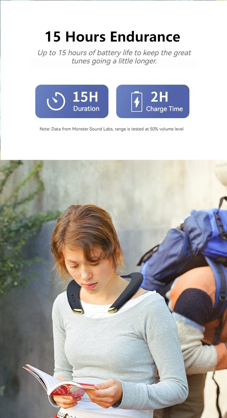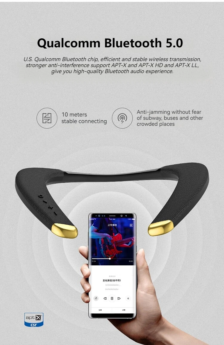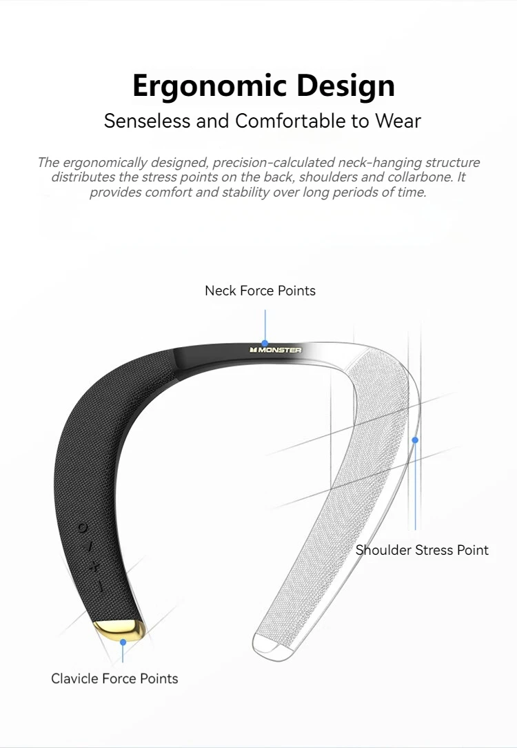 Monster wireless neck speaker adopts Bluetooth 5.0 Bluetooth technology and enjoys 2 times the transmission speed, no signal loss or music interruption. Compatible with any Bluetooth-enabled devices, including smartphones, computers, and TVs. Featuring aptX Low Latency technology, allows you to reduce Bluetooth delay- delivering high-quality sound in perfect synchronization.