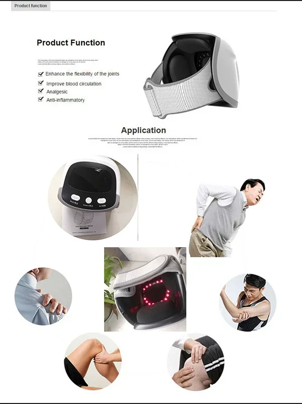 1.The functions of the pain therapeutic device includingred light therapy,laser therapy ,kneading massage and the carbon fiber far infrared thermal therapy, the treatment efficiency is obviously. Four functions into one device.