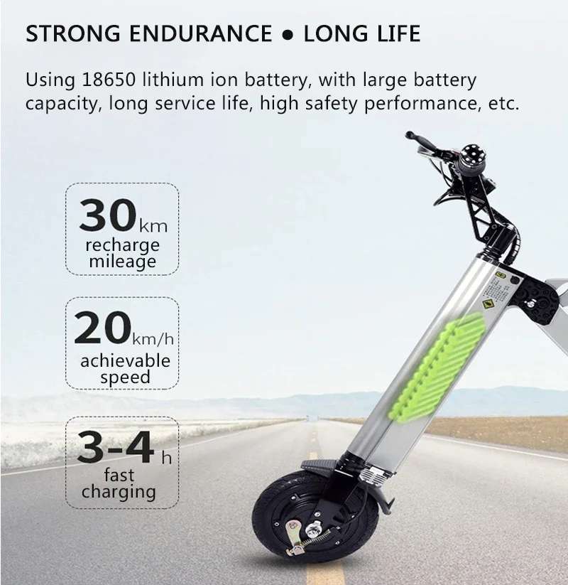 You can adjust the speed freely. Built in 18650 power lithium battery, power is 250W, charging duration of 3-4 hours, battery endurance of 30-45 km (18.6-28 miles), is the best choice for short trips.