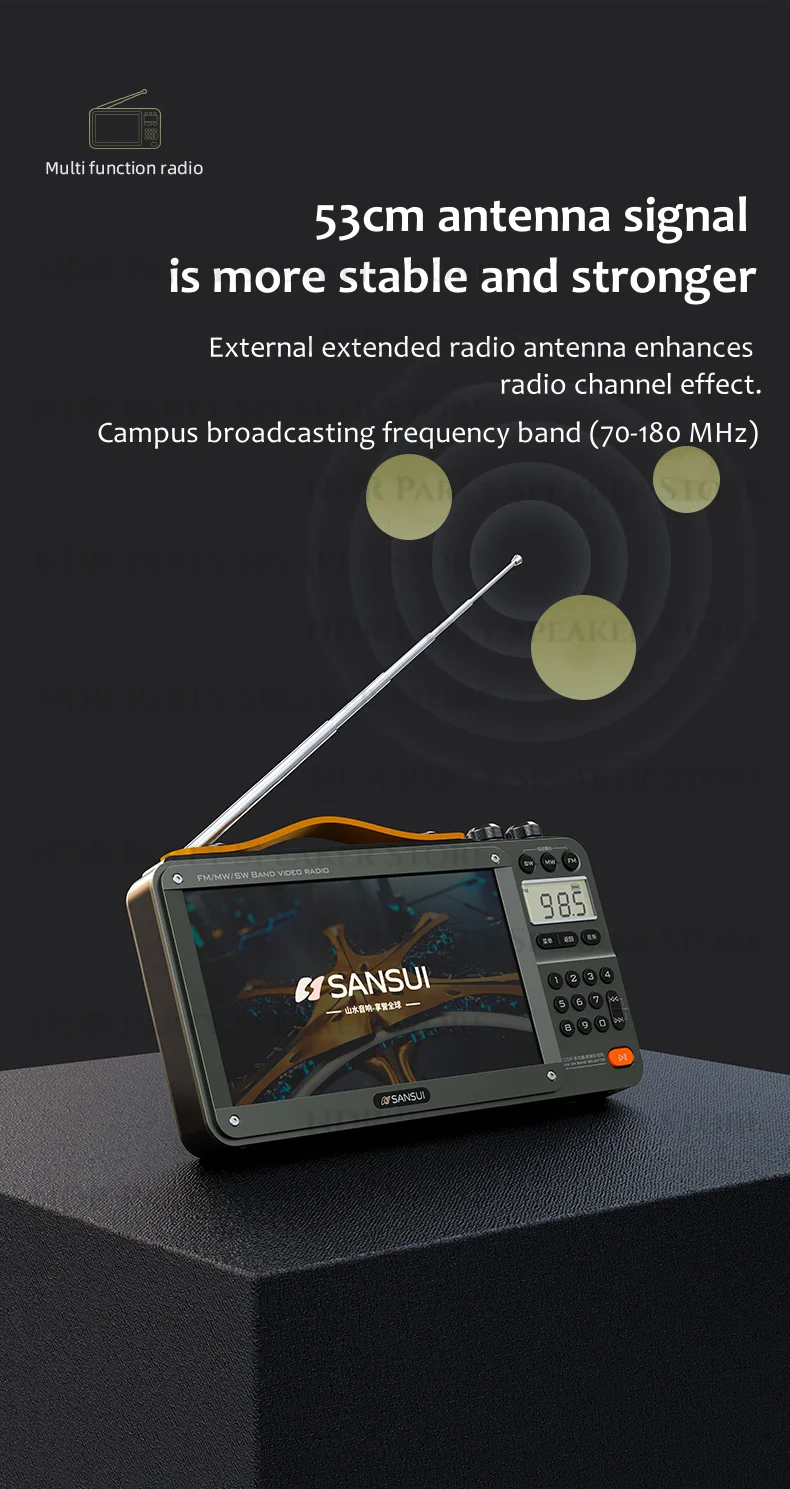 3. 360 degree rotating lever 53cm antenna, FM, MW, SW high sensitivity radio, automatic radio reception, FM radio support for campus broadcasting.