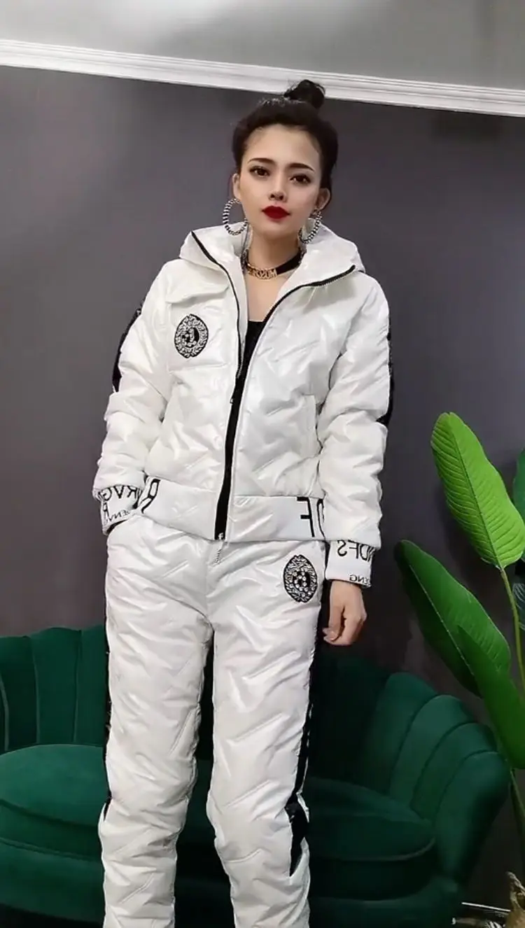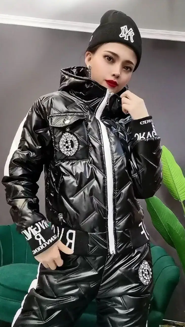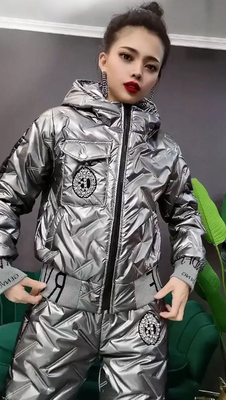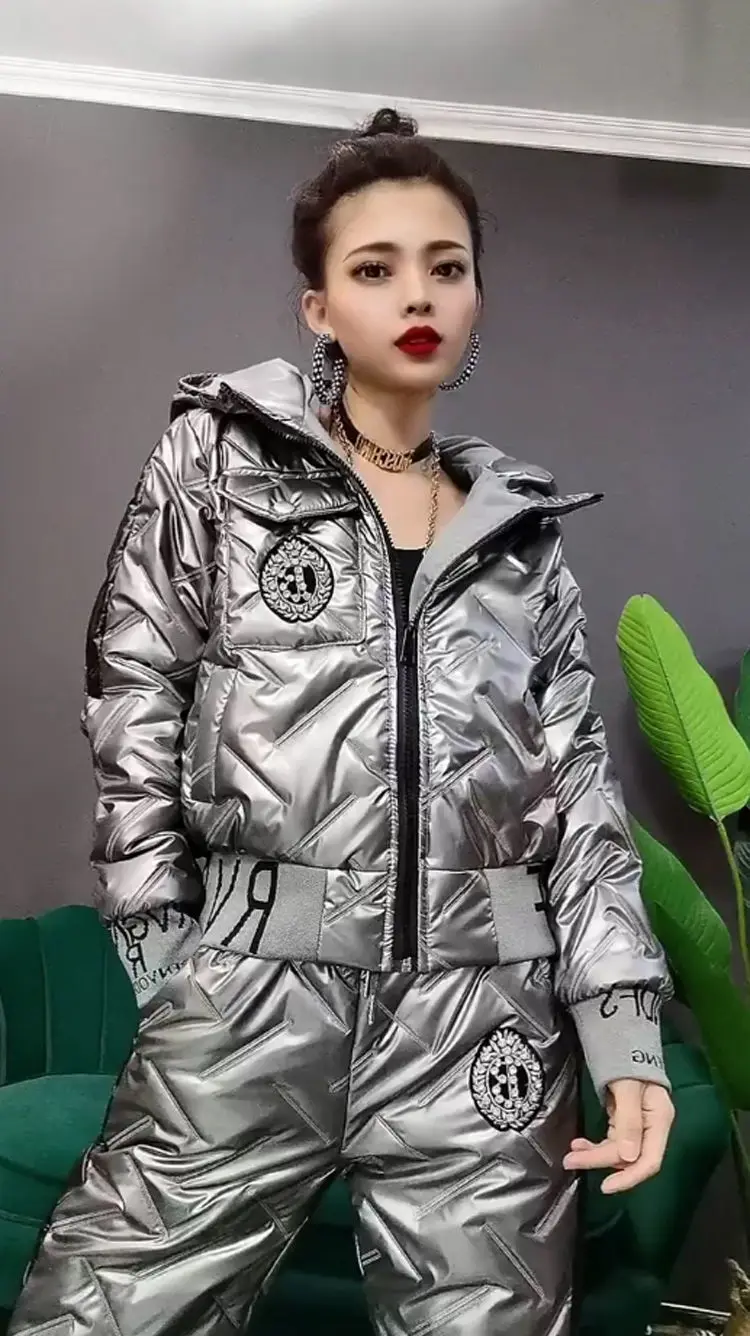 Winter Korean Glossy Parka Women Suit Oversized 4Xl 5Xl Two Piece Set Casual Hooded Cotton Padded Short Coat + Thicken Pant Sets