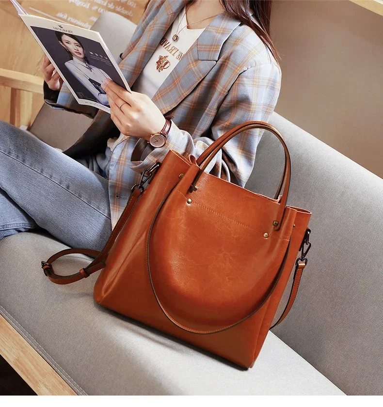 Women'S Cow Genuine Leather Handbags Lady Vintage Retro Cowhide Shoulder Bag Ladies Luxury Large Capacity Multiple Pockets Lady