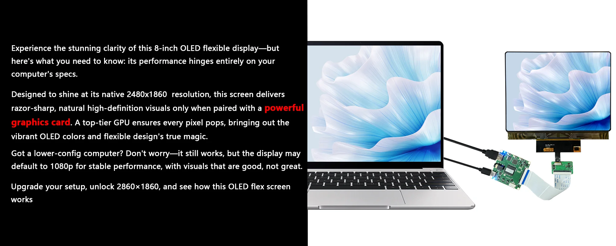 ---For optimal display performance, we recommend using a high-configured computer—such as one supporting output resolutions from 2.5K to 4K, equipped with a dedicated graphics card, and featuring HD-MI 2.0 or higher. These specifications are essential to recognize the screen' native resolution of 2480*1860 or to deliver excellent AMOLED display quality.