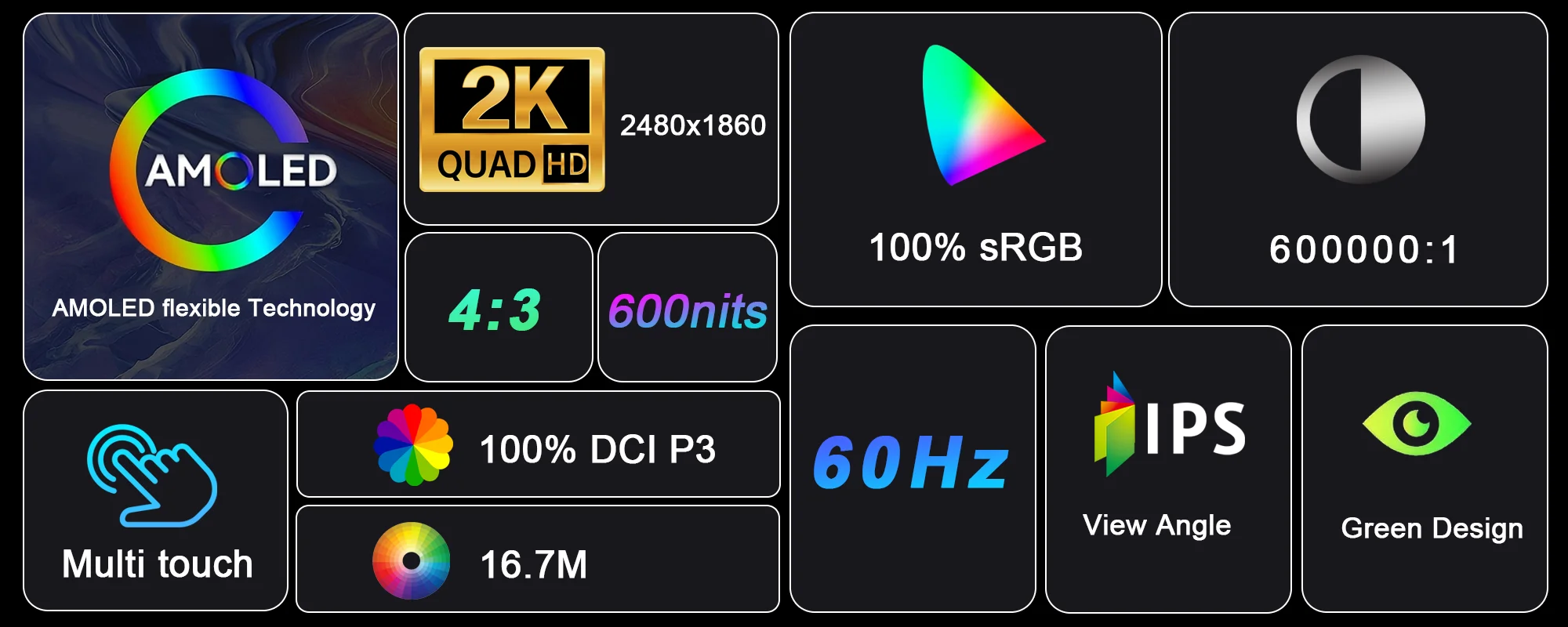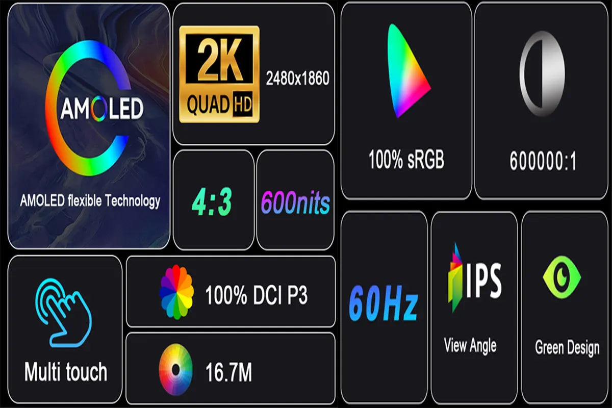 Stunning 2K Resolution – 2480×1860 Pixels, 600nits Adjustable Brightness