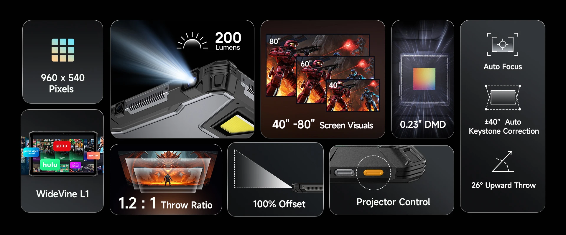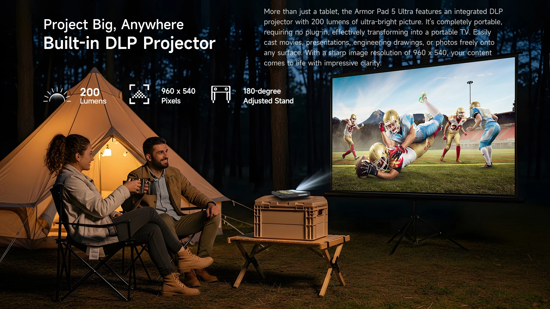 More than just a tablet, the Armor Pad 5 Ultra features an integrated DLP projector with 200 lumens of ultra-bright picture. It's completely portable, requiring no plug-in, effectively transforming into a portable TV. Easily cast movies, presentations, engineering drawings, or photos freely onto any surface. With a sharp image resolution of 960 x 540, your content comes to life with impressive clarity.
