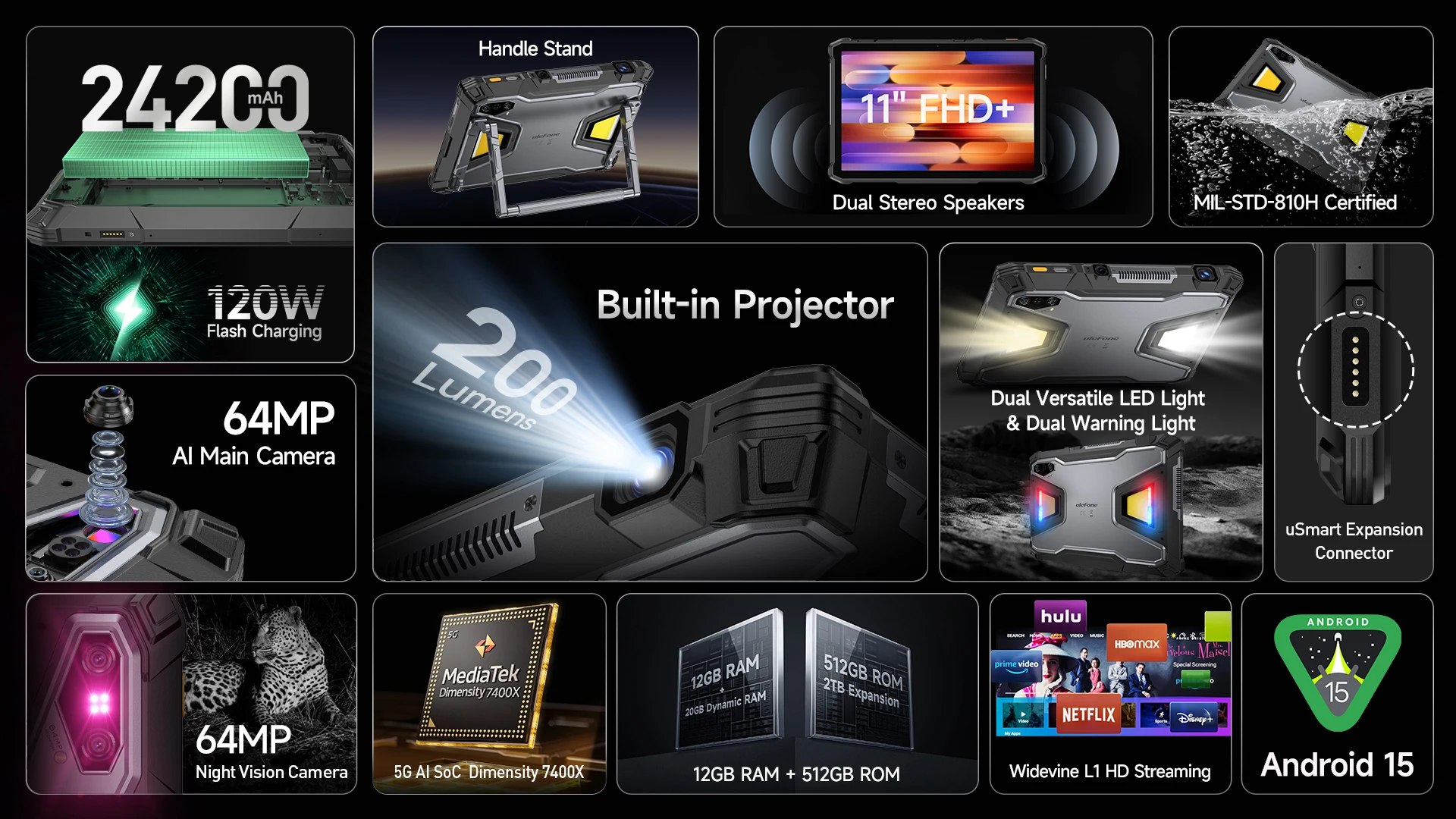 Armor Pad 5 Ultra 5G Rugged Tablet Portable Projector 200LM 24200 Mah 120W up to 12GB +512GB Android 15 11" FHD 64MP