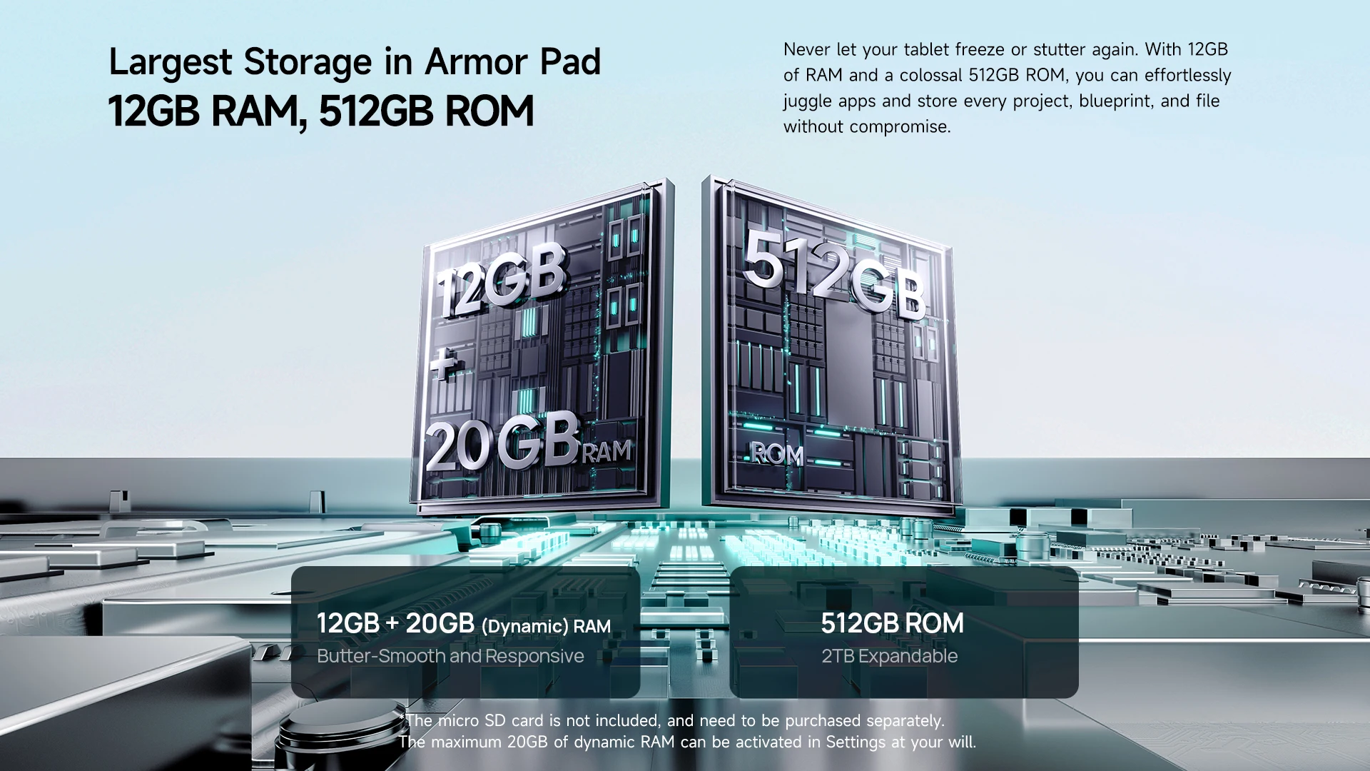 Never let your tablet freeze or stutter again. With 12GB of RAM and a colossal 512GB ROM, you can effortlessly juggle apps and store every project, blueprint, and file without compromise.