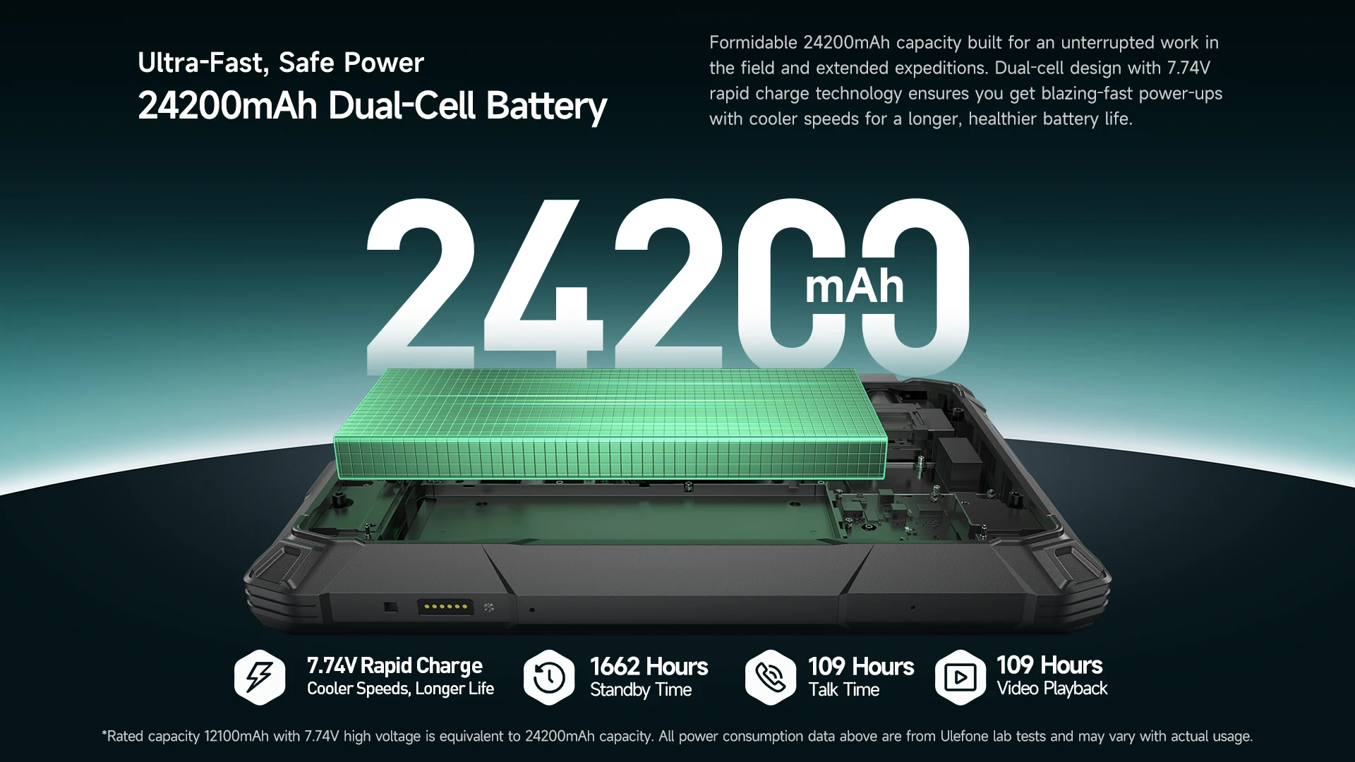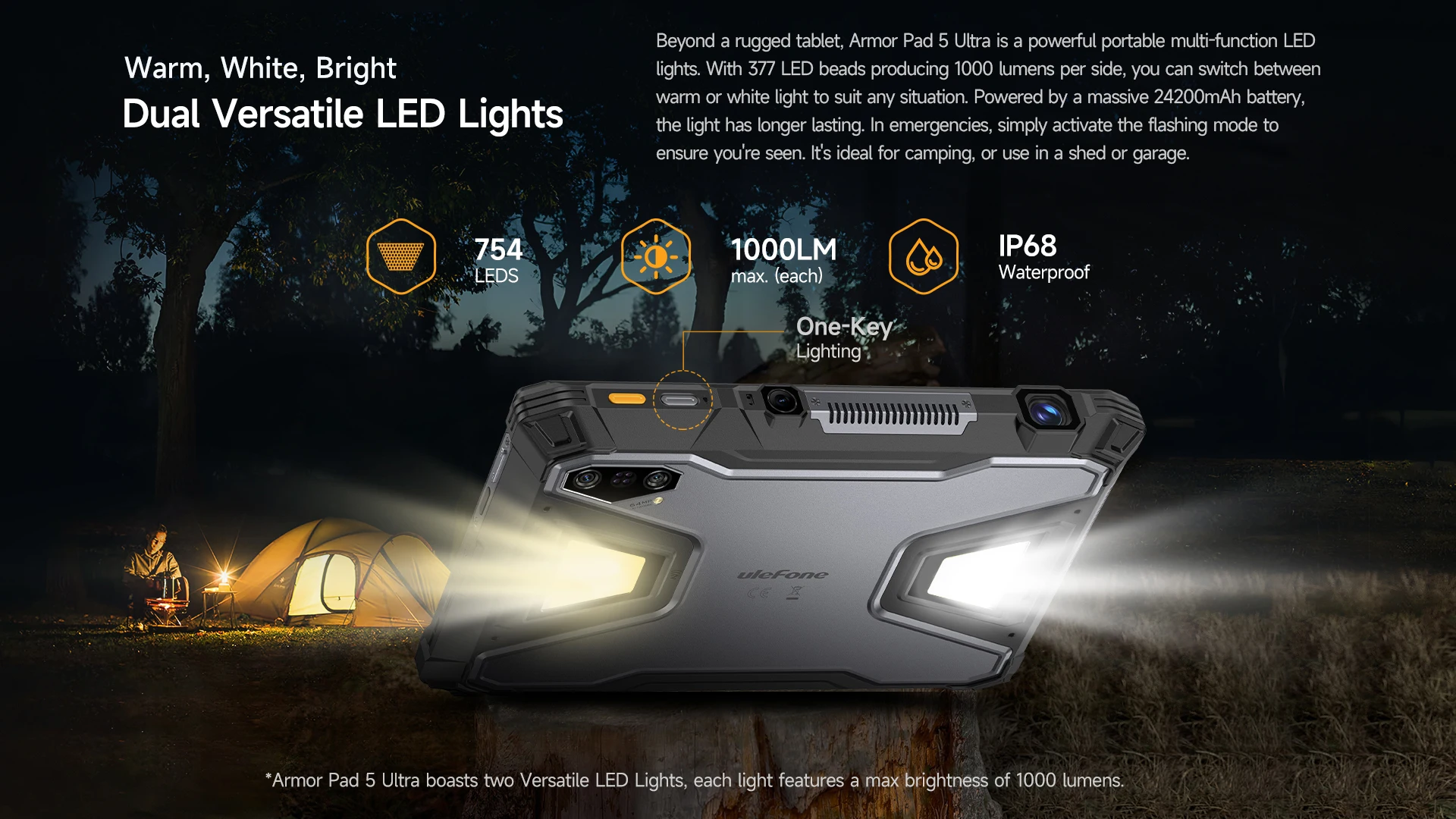 Beyond a rugged tablet, Armor Pad 5 Ultra is a powerful portable multi-function LED light. With 377 LED beads producing 1000 lumens per side, you can switch between warm or white light to suit any situation. Powered by a massive 24200mAh battery, the light has longer lasting. In emergencies, simply activate the flashing mode to ensure you're seen. It's ideal for camping, or use in a shed or garage.