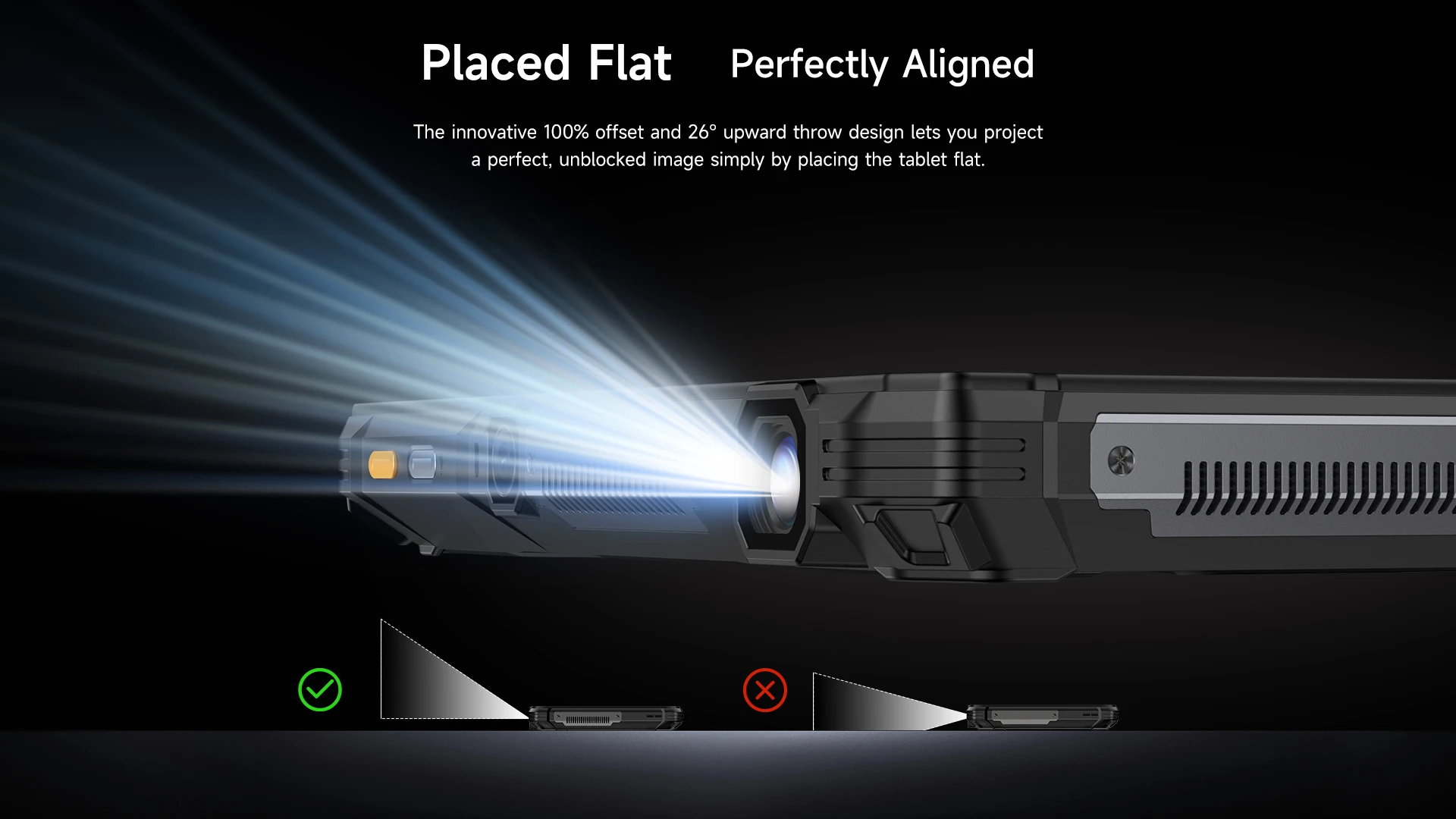 The innovative 100% offset and 26° upward throw design lets you project a perfect, unblocked image simply by placing the tablet flat.