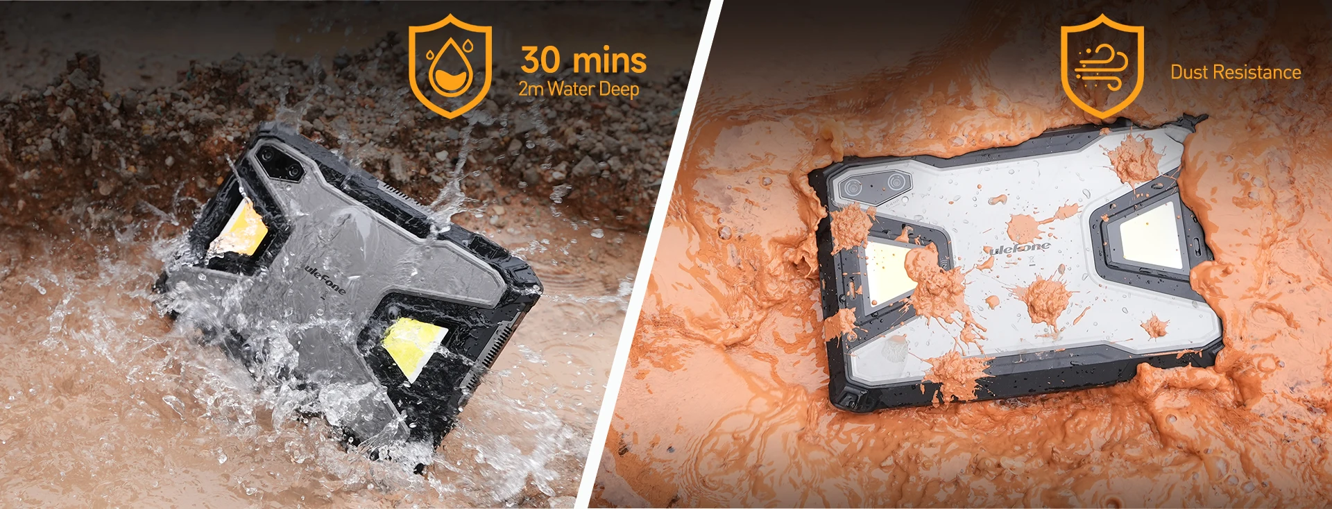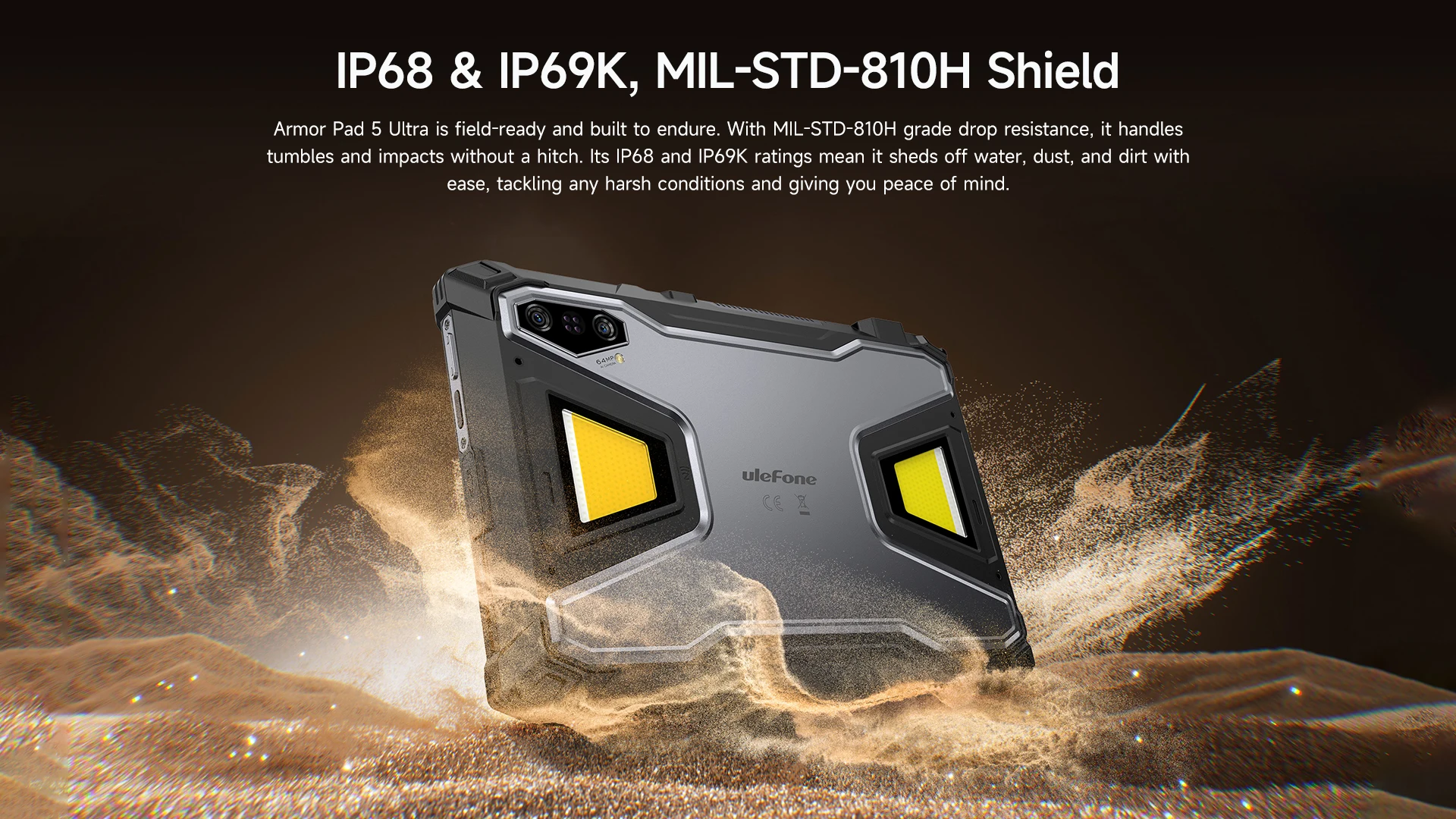 Armor Pad 5 Ultra is splash, water, and dust resistant and was tested under controlled laboratory conditions with a rating of IP68 under IEC standard 60529 (maximum depth of 1.5 meters up to 30 minutes). Charger and accessories are not water-resistant. Splash, water and dust resistance are not permanent and might decrease as a result of normal wear. Do not attempt to charge a wet Armor Pad 5 Pro. Liquid damage not covered under warranty.