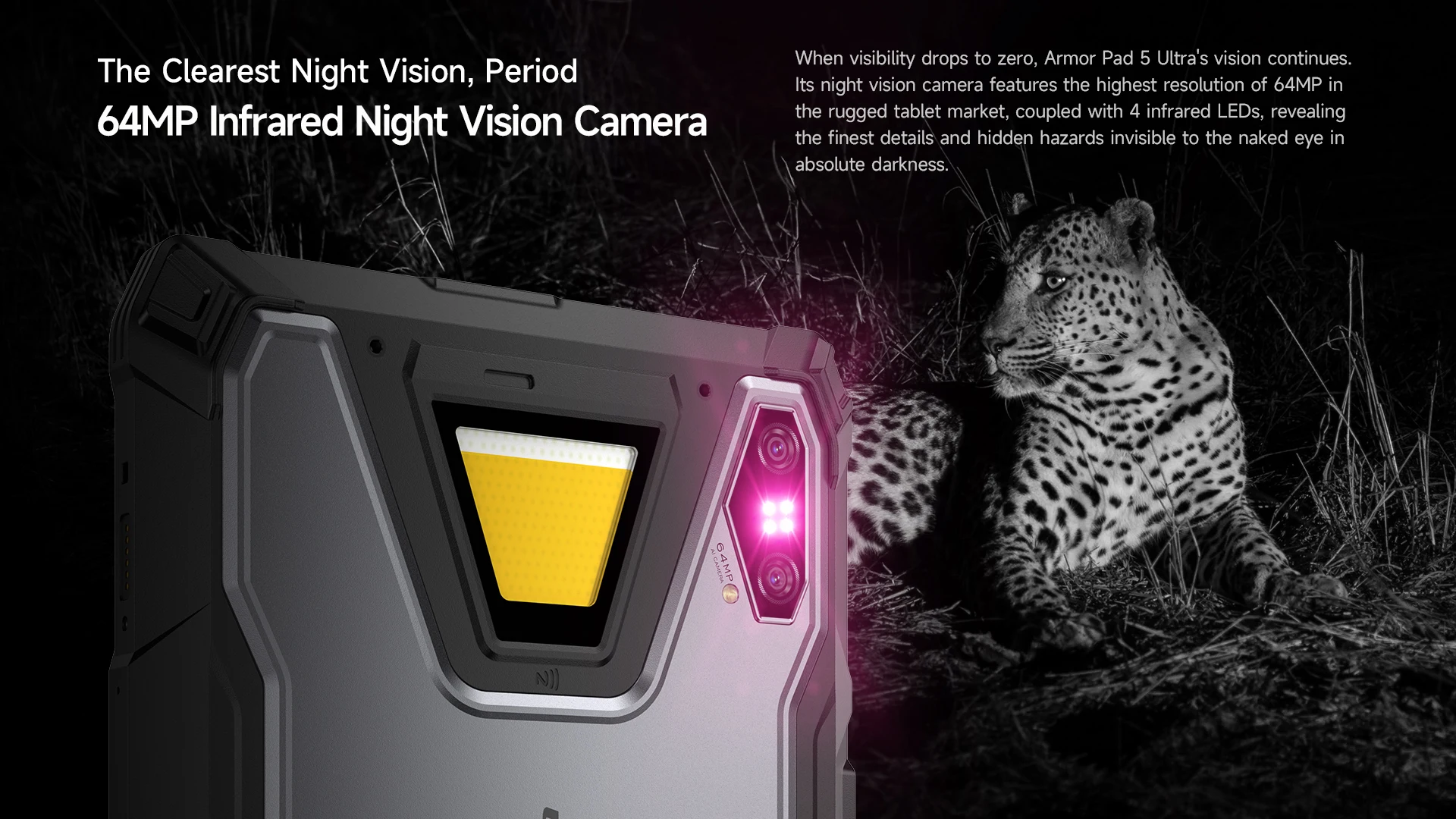 When visibility drops to zero, Armor Pad 5 Ultra's vision continues. Its night vision camera features the highest resolution of 64MP in the rugged tablet market, coupled with 4 infrared LEDs, revealing the finest details and hidden hazards invisible to the naked eye in absolute darkness.