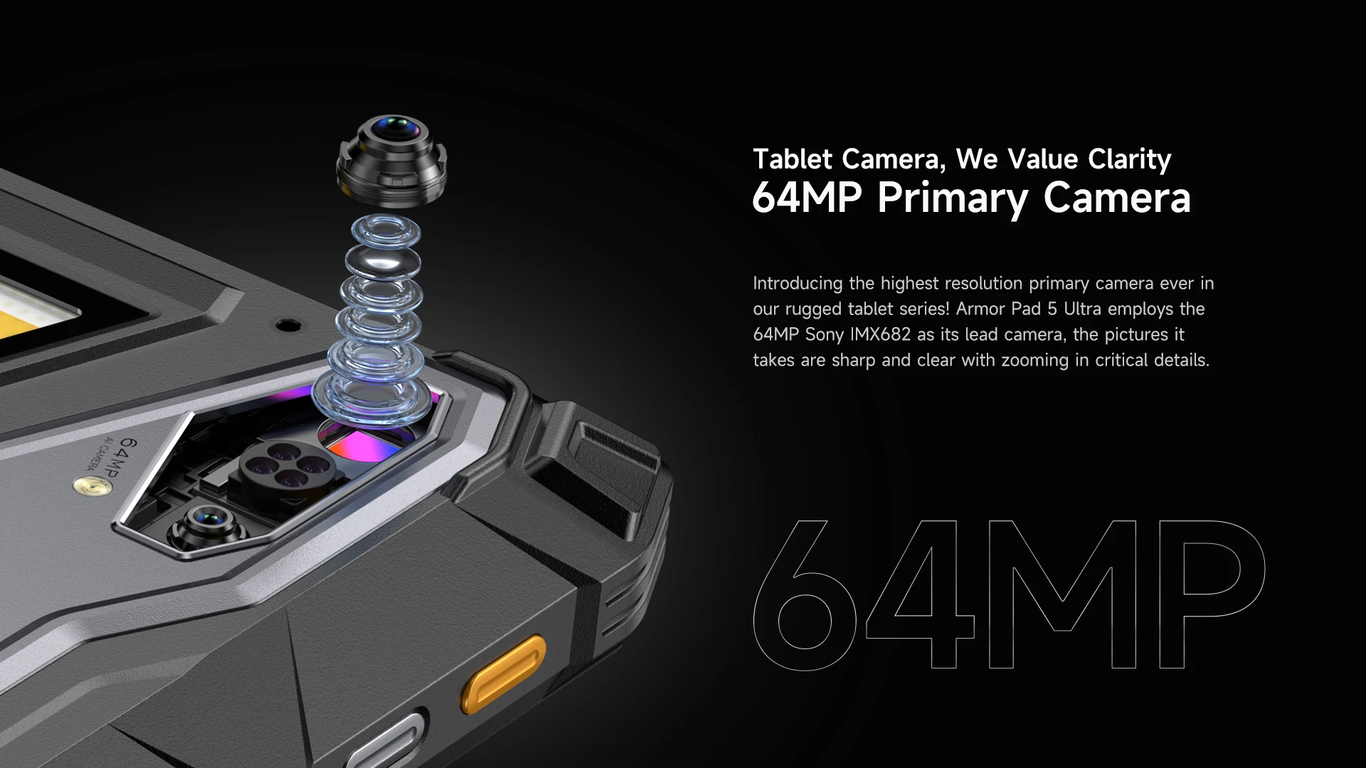 Introducing the highest resolution primary camera ever in our rugged tablet series! Armor Pad 5 Ultra employs the 64MP Sony IMX682 as its lead camera, the pictures it takes are sharp and clear with zooming in critical details.
