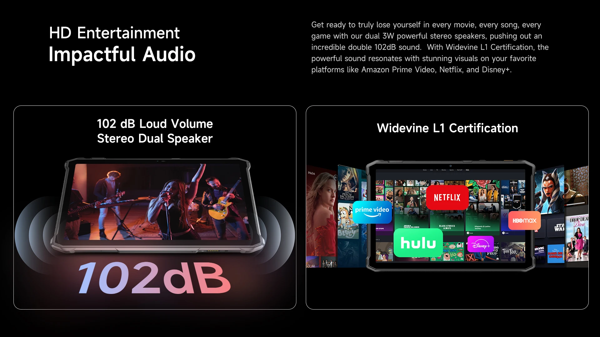 Get ready to truly lose yourself in every movie, every song, every game with our dual 3W powerful stereo speakers, pushing out an incredible double 102dB sound. With Widevine L1 Certification, the powerful sound resonates with stunning visuals on your favorite platforms like Amazon Prime Video, Netflix, and Disney+.