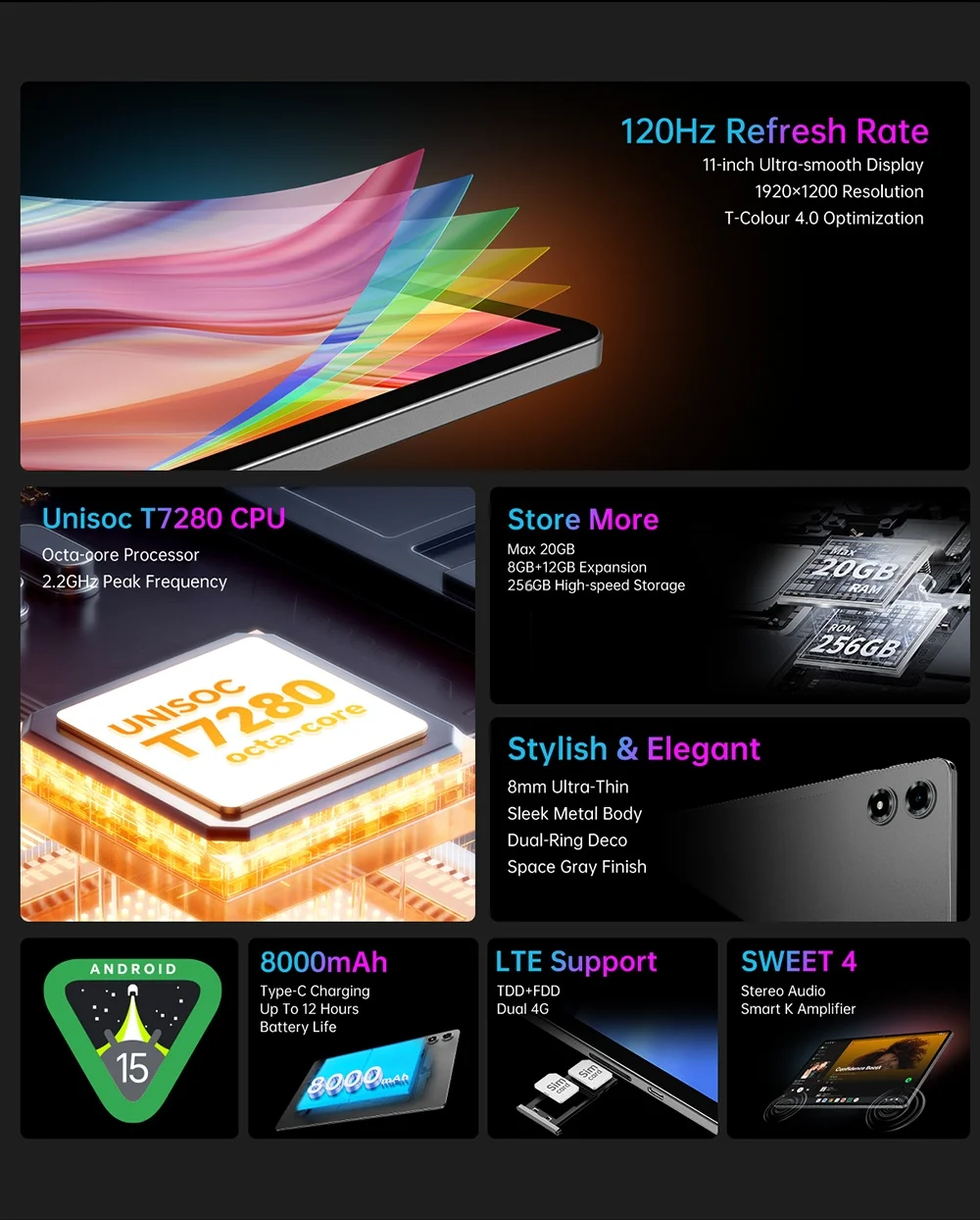T50PLUS Tablet (T7280 Octa-Core,8Gb RAM,256GB ROM/11 Inch/Android 15)With Keyboard &Wireless Mouse, Accessories Series