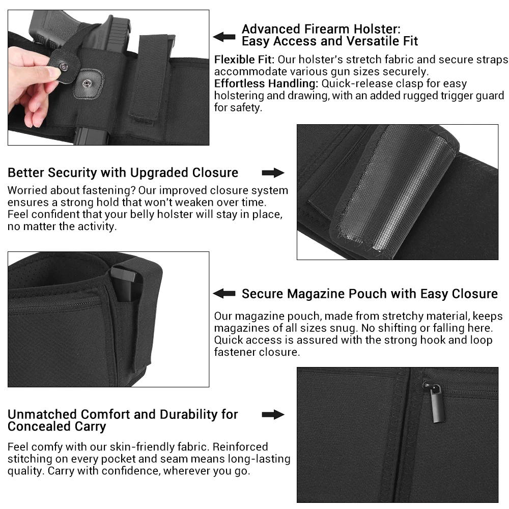 - Our belly band gun holster, meticulously tailored for both men and women, harmonizes comfort and security.