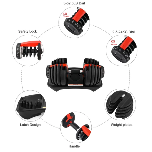 1.The dumbbell provides a wide array of weight optionsstarting at 5 lbs (2.5 kgs) and going up to 52.5 lbs (24 kgs),a total of 15 weight increments. 2.This innovative dumbbell is a versatile training tool that helps you reach your fitness goal and full-body strength foryour legs, back,chest,abs,shoulders, and arms. 3.Storage tray included. Stay organized with a storage tray that keeps your weights off the floor.
