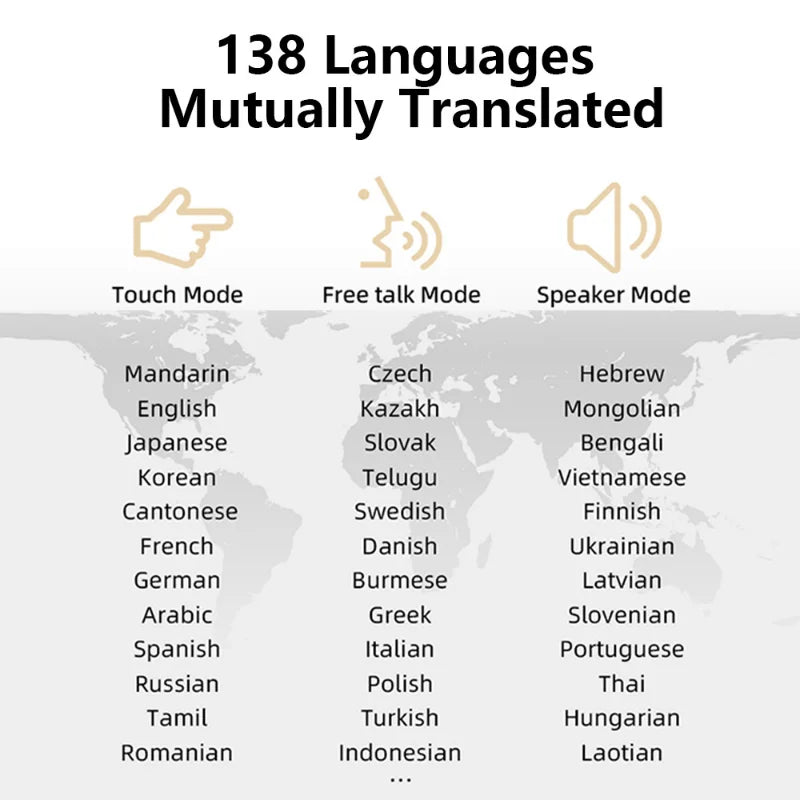 This device has 10 core advantages: zero sensing delay in translation/high precision, real-time translation/instant translation/140+national language translation/seamless connection Bluetooth flash connection 5.4/stable and fast connection/directional transmission technology stable and leak free/long-lasting stable connection/battery compartment battery level display remaining battery level visible at a glance/sound quality sound entering the ear quietly enjoying surging sound effects for a more comprehensive experience: lightweight ear hanging design: stable and comfortable listening without entering the ear, high-definition noise reduction technology: clear voice like face-to-face breakthrough ultra long battery life, no anxiety, bold listening, free running Touch mode. After touching the earphone, one can hear a "drip" sound and speak continuously, and both parties can hear simultaneous interpretation. When you want to speak, touch your headphones and hear After a beep, you can start speaking In external mode, you can tap/double-click on the earphones (or click on the lower half screen of the phone) to start speaking. After speaking, the phone will play the translated content. Click on the upper half screen of the phone to indicate that the other person is speaking to the phone, and you will hear the translated content from the earphones In free speaking mode, two people each wear one earphone. Tap/double-click on the earphone (or click on the start recognition on the screen) to perform real-time translation, release both hands, and communicate freely