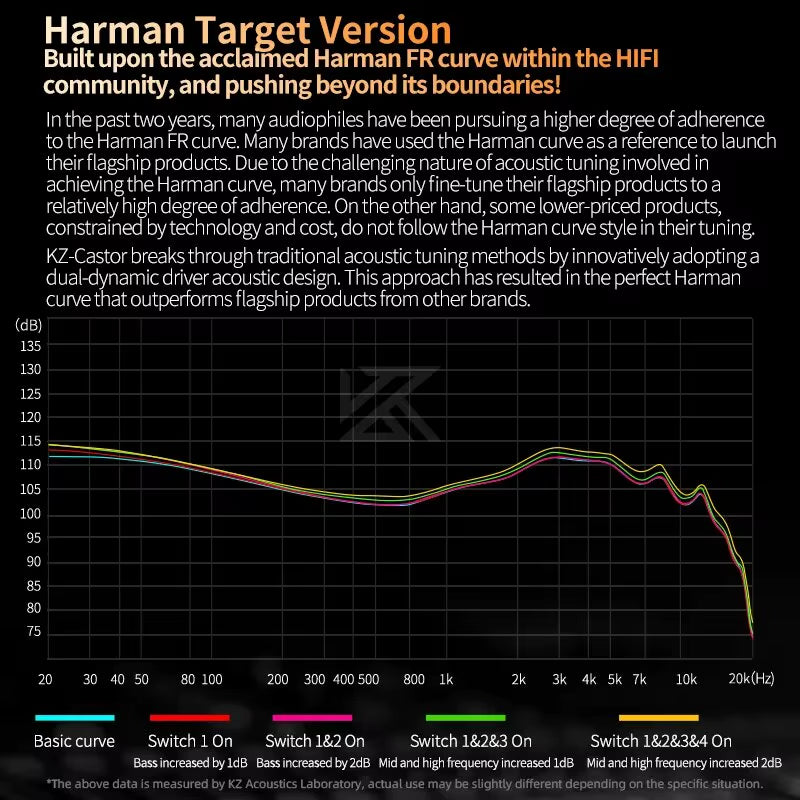 KZ-Castor breaks through traditional acoustic tuning methods by innovatively adopting a dual-dynamic driver acoustic design. This approach has resulted in the perfect Harman curve that outperforms flagship products from other brands.