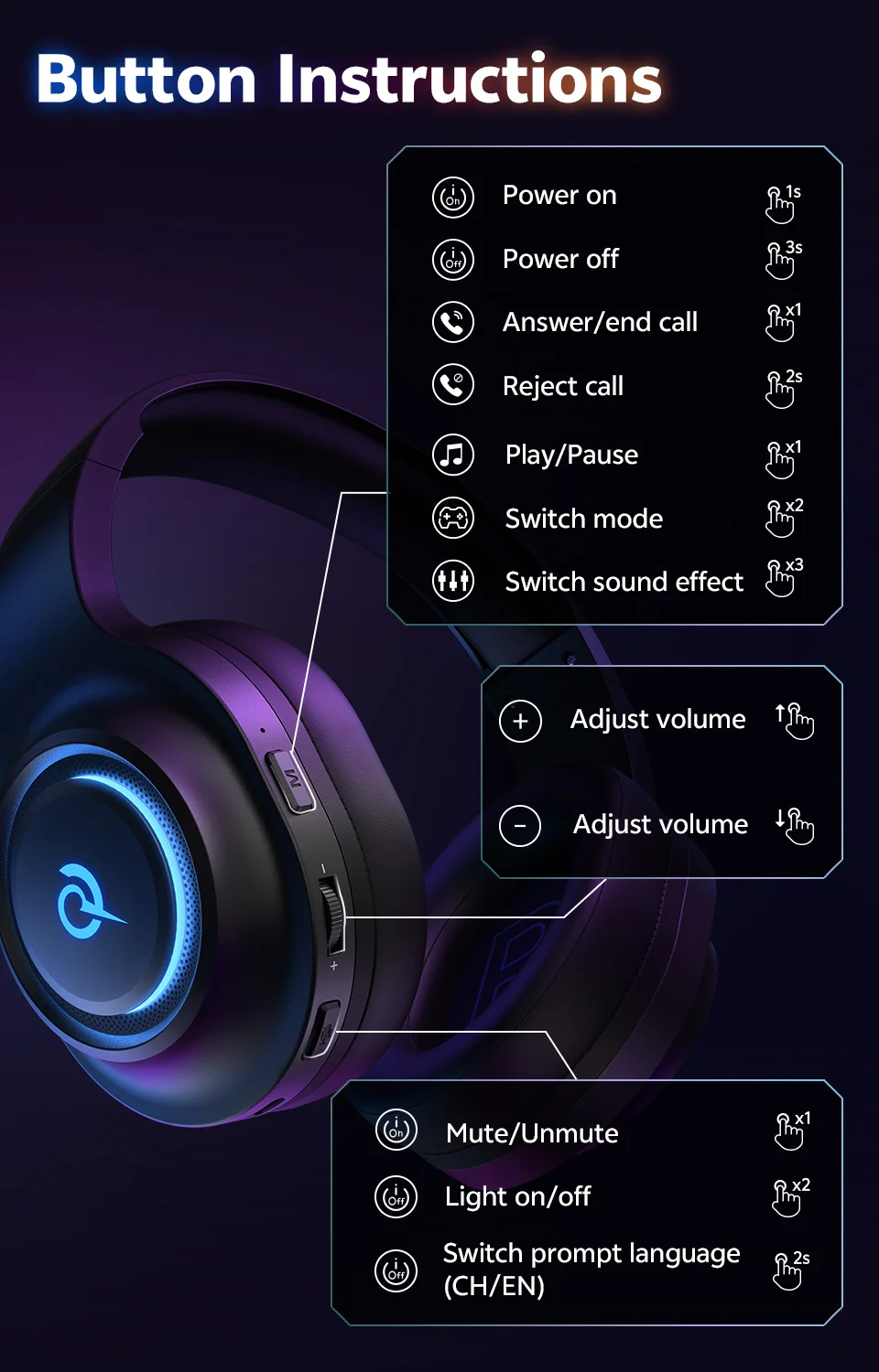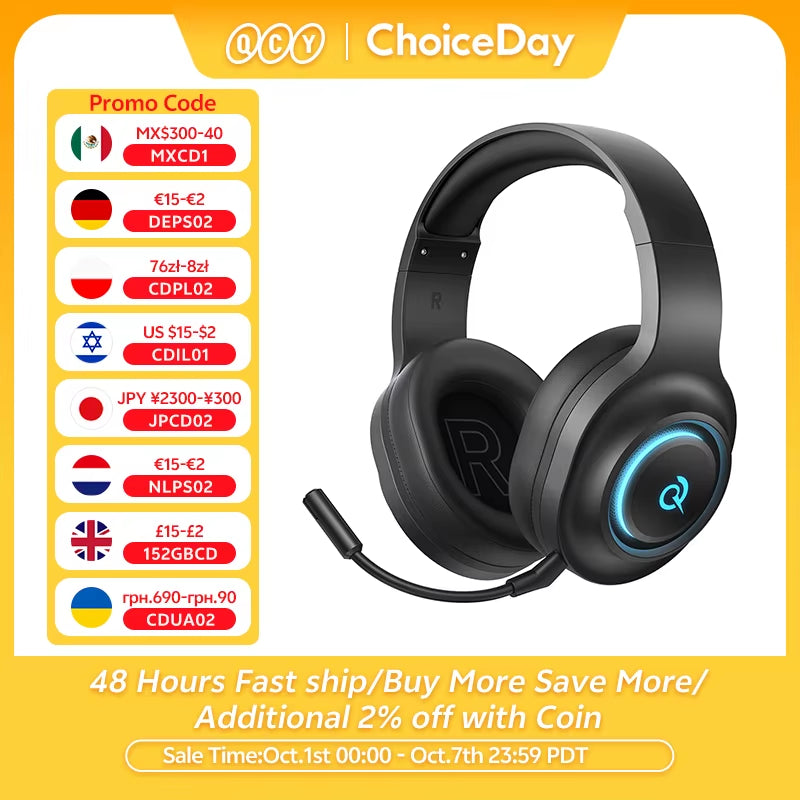 QCY Heroad V200 Gaming Over Ear Headphone Wireless Bluetooth 6.0 with Mic 50mm Driver 7.1 Surround Sound Dynamic EQ RGB Headset