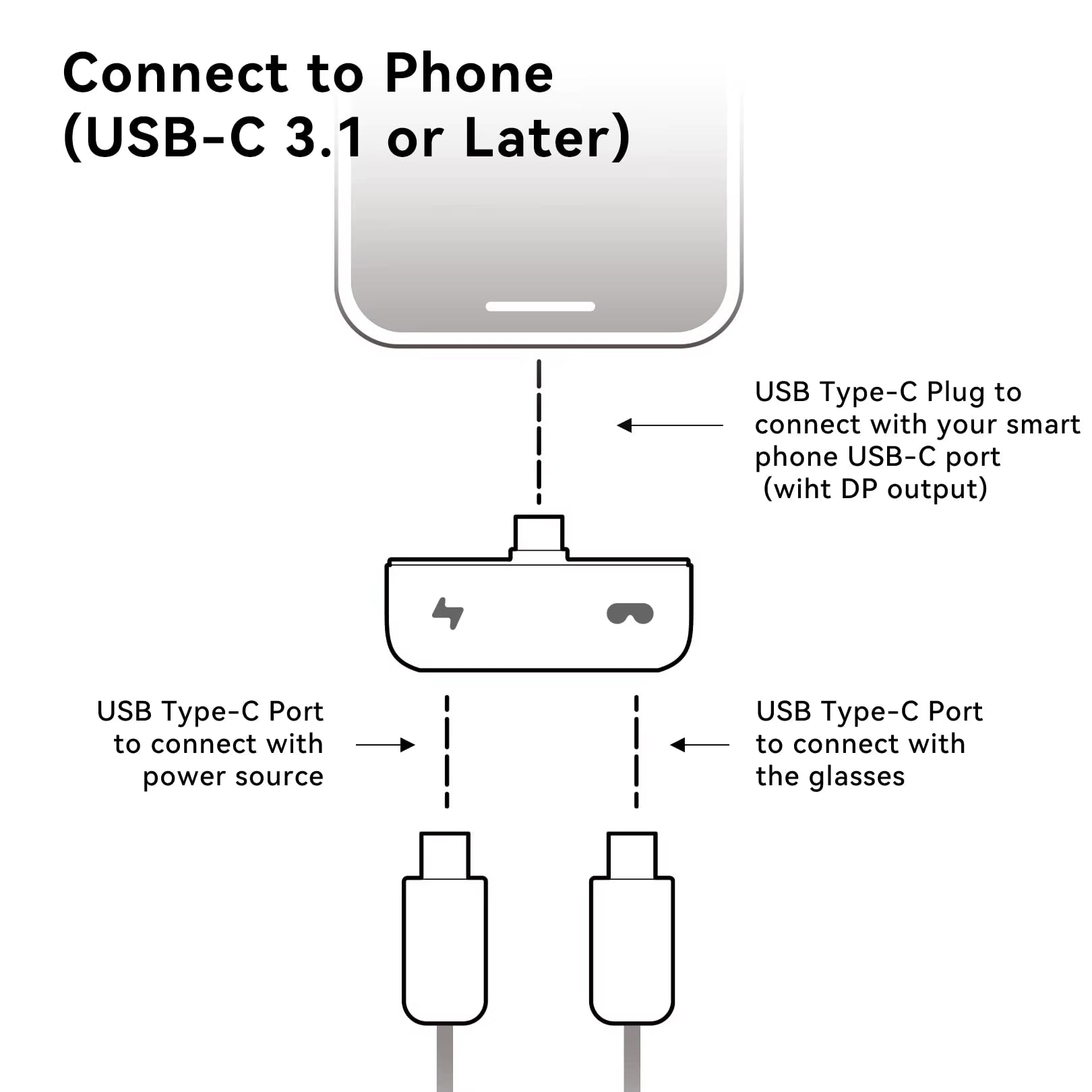 When the glasses are connected to the smartphone through the mini hub, the function of charging and using can be realized to ensure sufficient power.