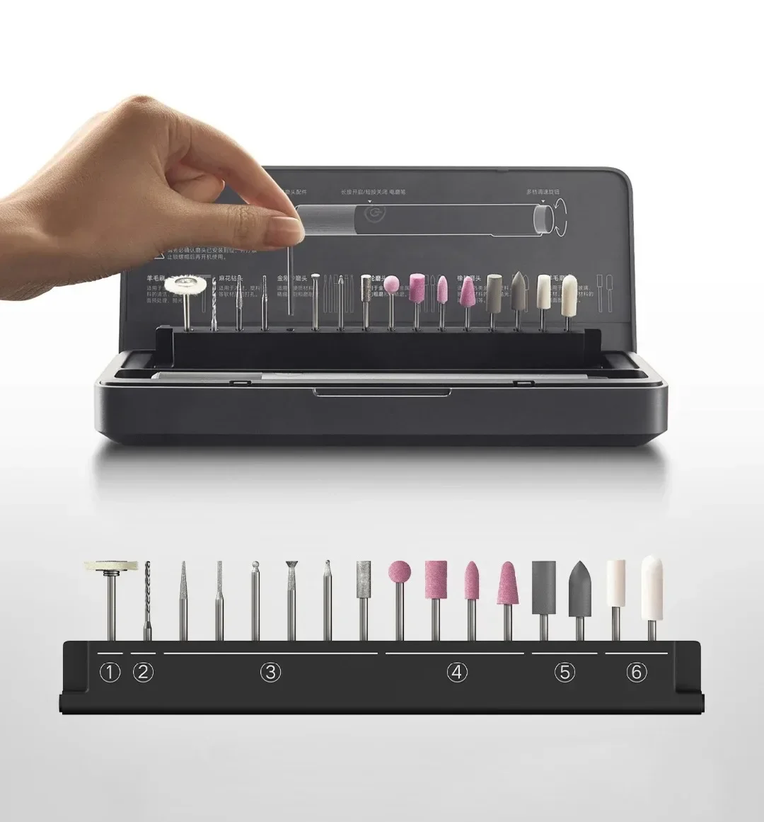 * Automatic pop-up storage box, loaded with 16 high-quality grinding heads with a rod diameter of 2.35mm.