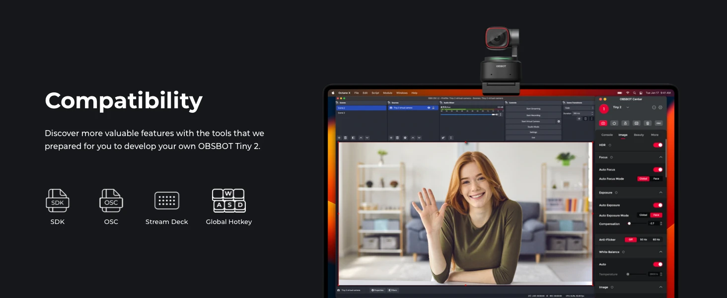 OBSBOT Tiny 2 Webcam 4K Voice Control PTZ, AI Tracking Multi-Mode & Auto Focus, Web Camera with 1/1.5" Sensor, Gesture Control,