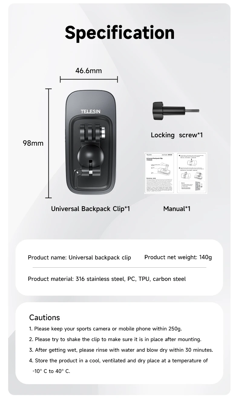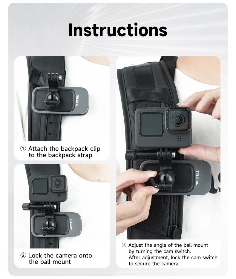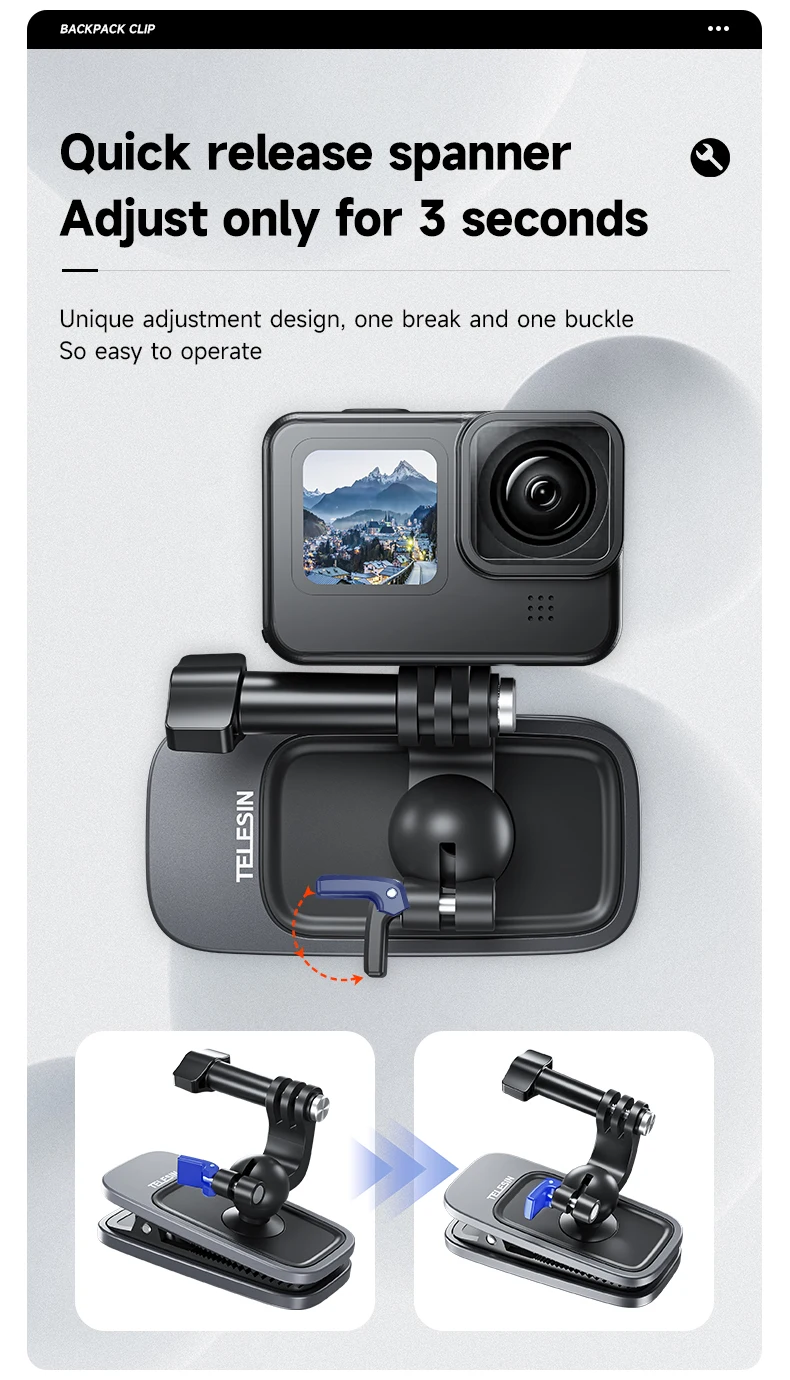 360° Universal adjustmen Always positive angle.Normal backpack clips limit the angle. The backpack clip has to be adjusted to switch the angle, which is more troublesome.