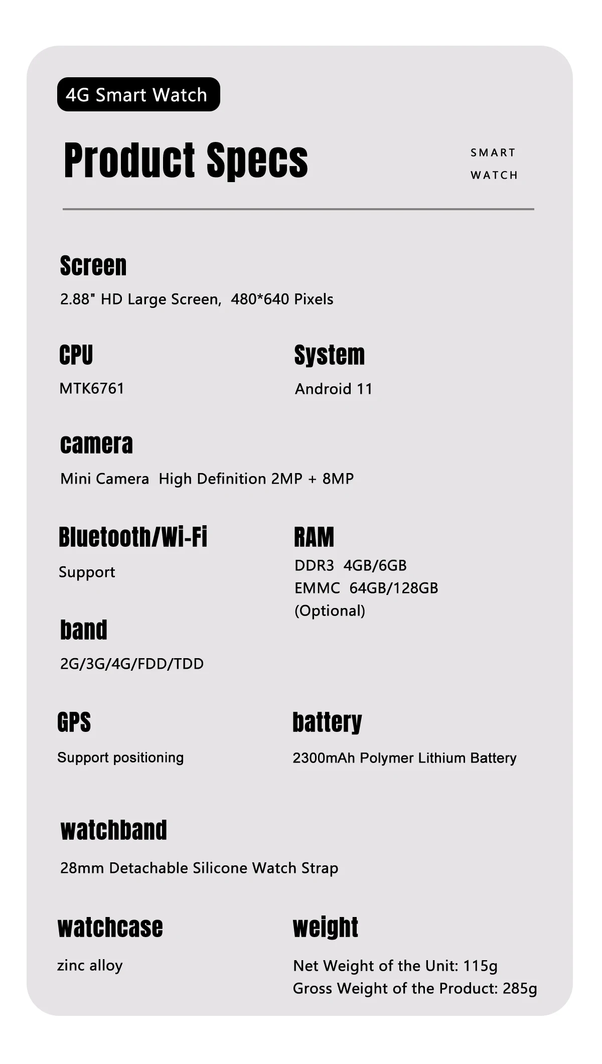 Support Nano SIM card, 4G LTE network, WiFi, BT 5.0 wireless connection, 2.88 inch round touch screen, bring you a smart phone-like smart experience.