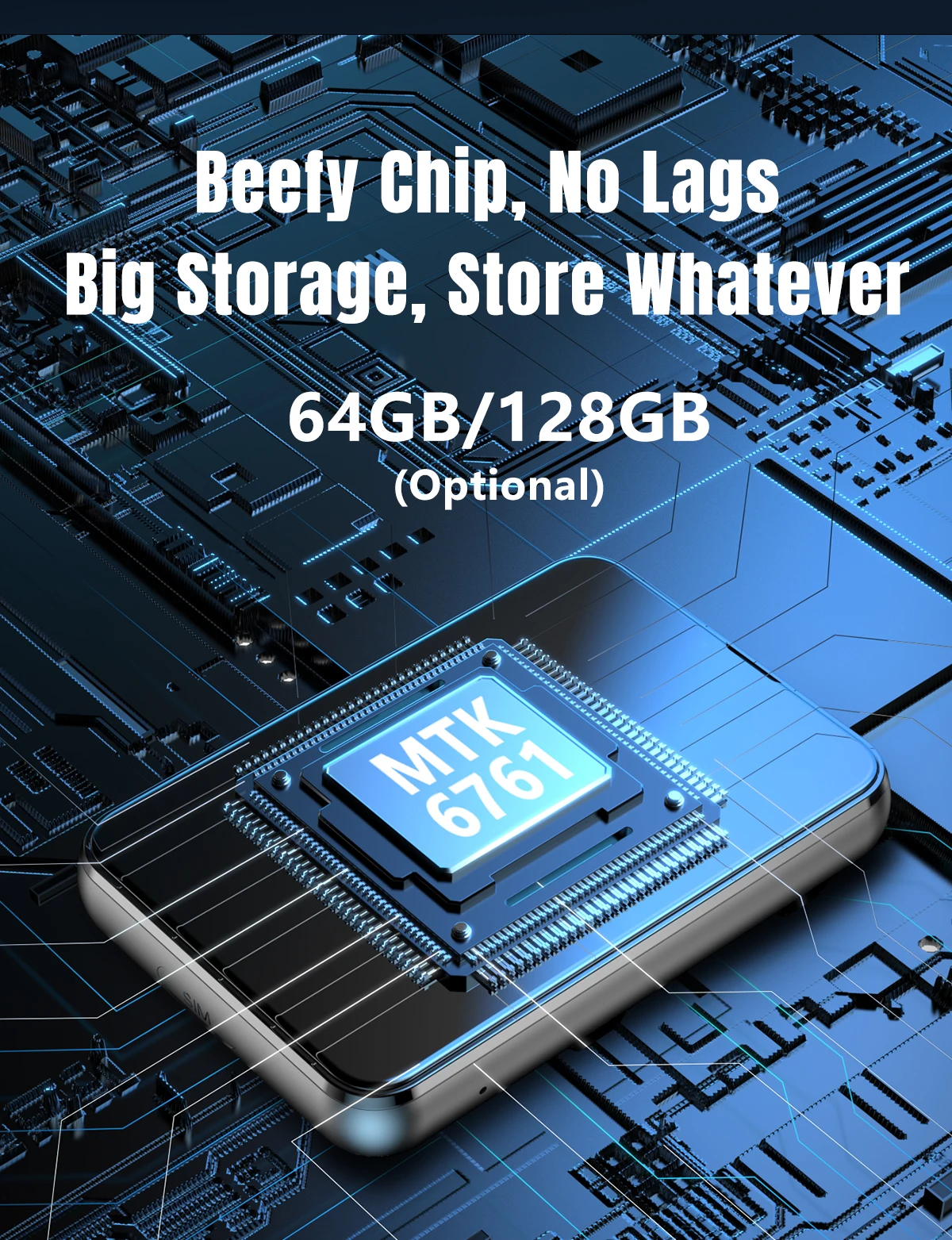 MT6761 quad-core CPU, with Android 11.0 system, 4GB RAM and 64GB ROM.