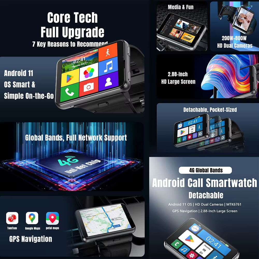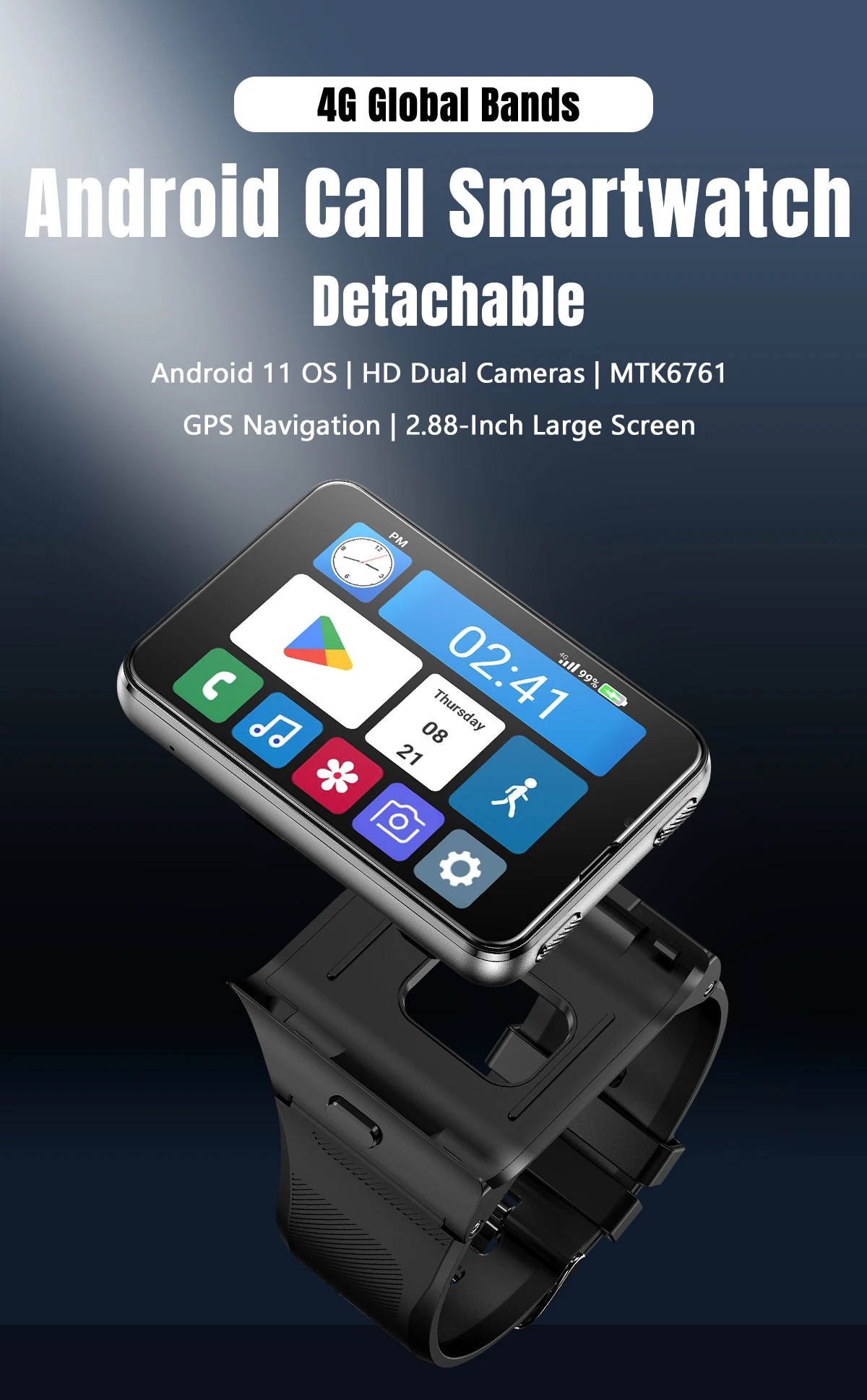 Upgrade S999 4G Android 11 OS Smart Watch MTK6761 Quad Core 2.88 Inch HD Screen Detachable 4GB 64GB Dual Camera GPS WIFI Compass