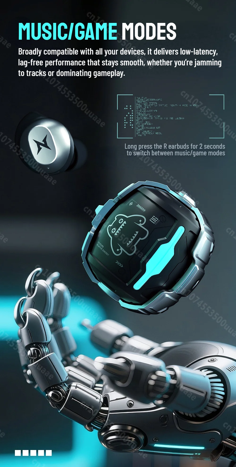 ● Game mode: Long-press right touch area for 2s to switch between music and game modes (except during calls).