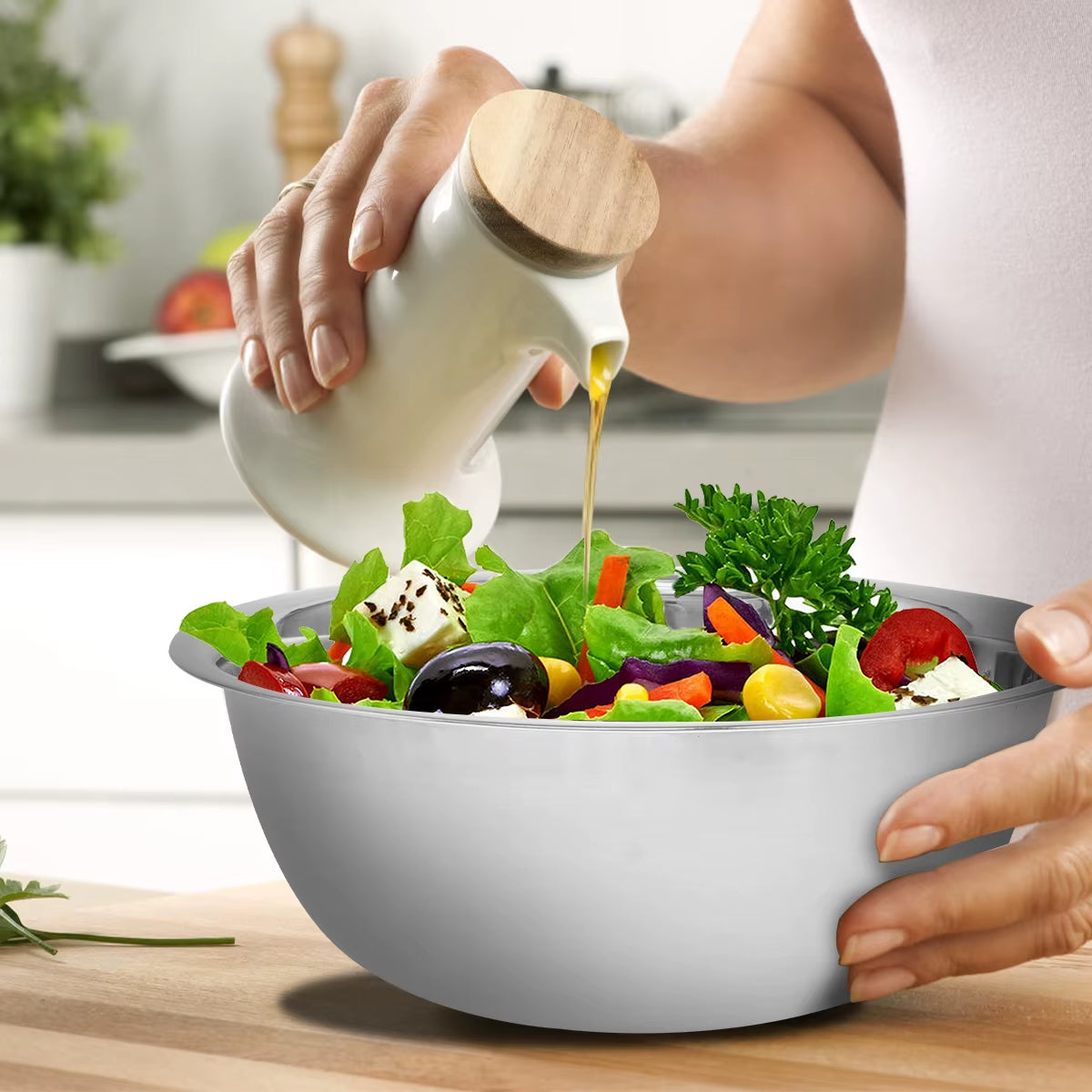 [5 Sizes & Multipurpose] Set includes 5 sizes of mixing bowls (4.5QT, 3QT, 2QT, 1.5QT, 0.7 QT). Ideal for baking, mixing large batters, preparing salads, washing vegetables and more to fulfill your kitchen's basic needs, no need to spend a lot of time and money buying each item separately.
