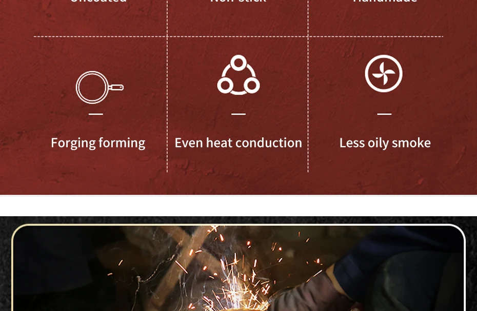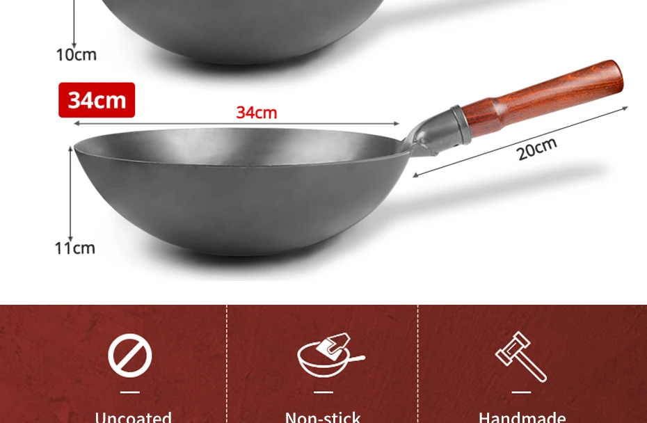 4.Physically non-stick, no coating, no painting, only iron. The hammered high density surface conducts heat faster and evenly, absorbs less oil, and generates less smoke. It is simply healthy.